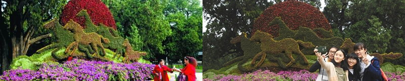 中山公园、玉渊潭公园、景山公园、紫竹院公园将对祖国蓬勃发展、繁荣祥和的美好祝愿融入主题花坛的设计方案。中山公园“奔腾”花坛,表现出一群骏马在太阳升起的时候,飞奔到空中,踏过彩虹的剪影,寓意国家在党的领导下,犹如这五匹骏马,腾飞向前,不断创造新的辉煌;玉渊潭公园“祝福”主题系列花坛,以灯笼、红梅以及“祝福”字样搭配大花百日草、海棠、苹果树、苏铁等花卉,烘托喜迎十九大、祝福祖国繁荣昌盛的喜庆氛围。