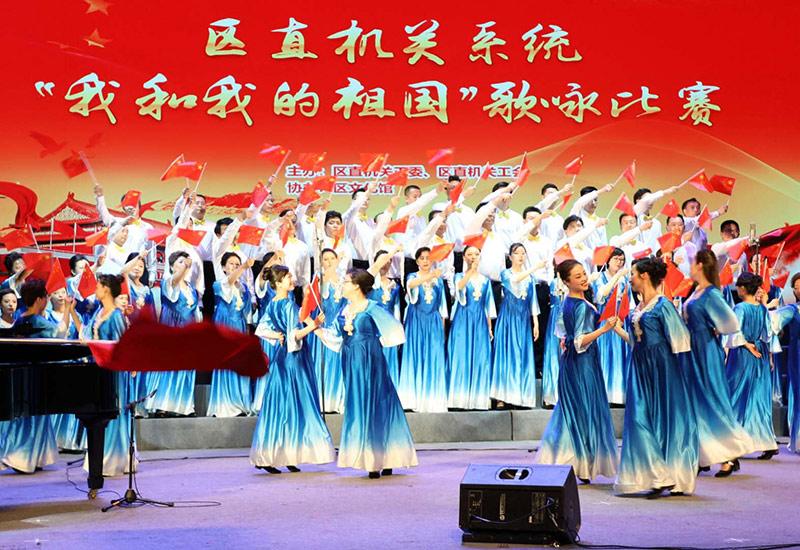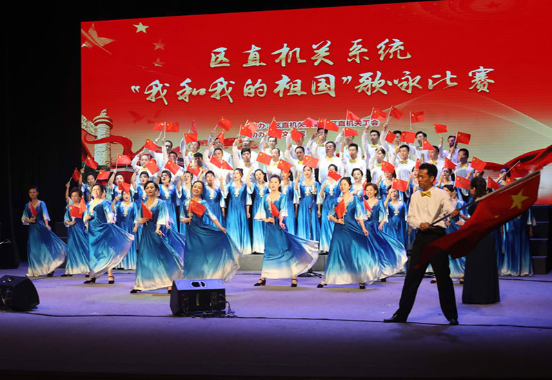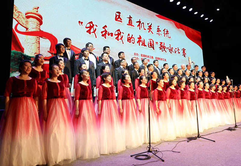 2019年5月27日,由北京市西城区区直机关系统主办的“我和我的祖国”歌咏比赛在西城区鑫融剧场举行。来自全区58个单位的33支合唱队1500余名西城干部用饱满的激情和嘹亮的歌声抒发了对祖国的热爱。
