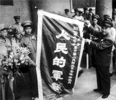 最后,各全国性的人民团体、北京市各人民团体及北京市少年儿童代表相继向毛主席、朱总司令暨人民解放军全体指战员献旗献花,由朱总司令一一接受。献给解放军的锦旗上面写着五个醒目大字“人民的军队”,这充分表达了全国人民对解放军的无限热爱和高度信任。