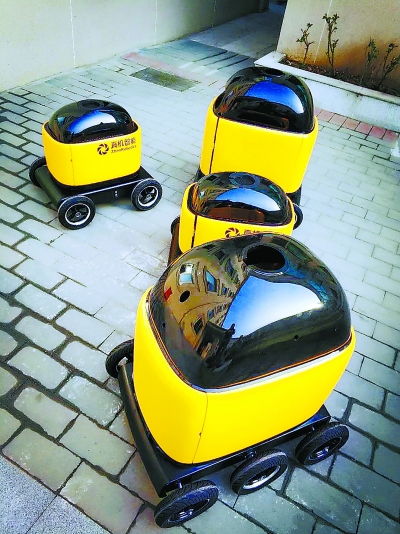 4月8日,在中关村智造大街,萌萌的快递机器人整装待发。于丽爽摄