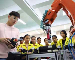 ↑小学生在苏州工业职业技术学院体验操作机器人。