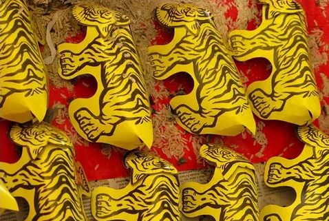 大家为了自保,便在惊蛰那天祭白虎。所谓祭白虎,是指拜祭用纸绘制的白老虎,纸老虎一般为黄色黑斑纹,口角画有一对獠牙。拜祭时,需以肥猪血喂之,使其吃饱后不再出口伤人,继而以生猪肉抹在纸老虎的嘴上,使之充满油水,不能张口说人是非。