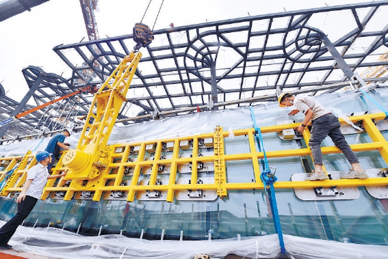 城市副中心图书馆昨天实现封顶,即将安装的首批玻璃幕墙运抵施工现场。(蔡代征 摄)