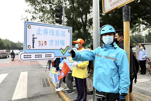 2021年9月28日一早,华联商厦东北侧的十字路口,由交警、交通协管员、文明引导员、网约配送员,丰台马家堡街道机关党员干部和社区志愿者组成了“礼让斑马线”宣传小分队,在路口挥动着写有“礼让行人你们好棒”、“为礼让司机点赞”的标语牌子,向来往行人、车主发起“礼让斑马线”的倡议。