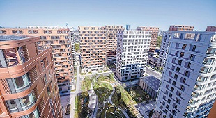 北京冬奥村橘黄、银白两种颜色的公寓楼错落有致排列在一起,颇有设计感。(潘之望 摄)