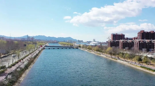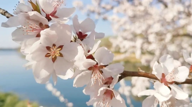 “山桃花粉白粉白层层叠叠的,非常漂亮,在配上碧水蓝天和远处的柳树,有种万条垂下绿丝绦的感觉,特别享受。”一位市民说道。