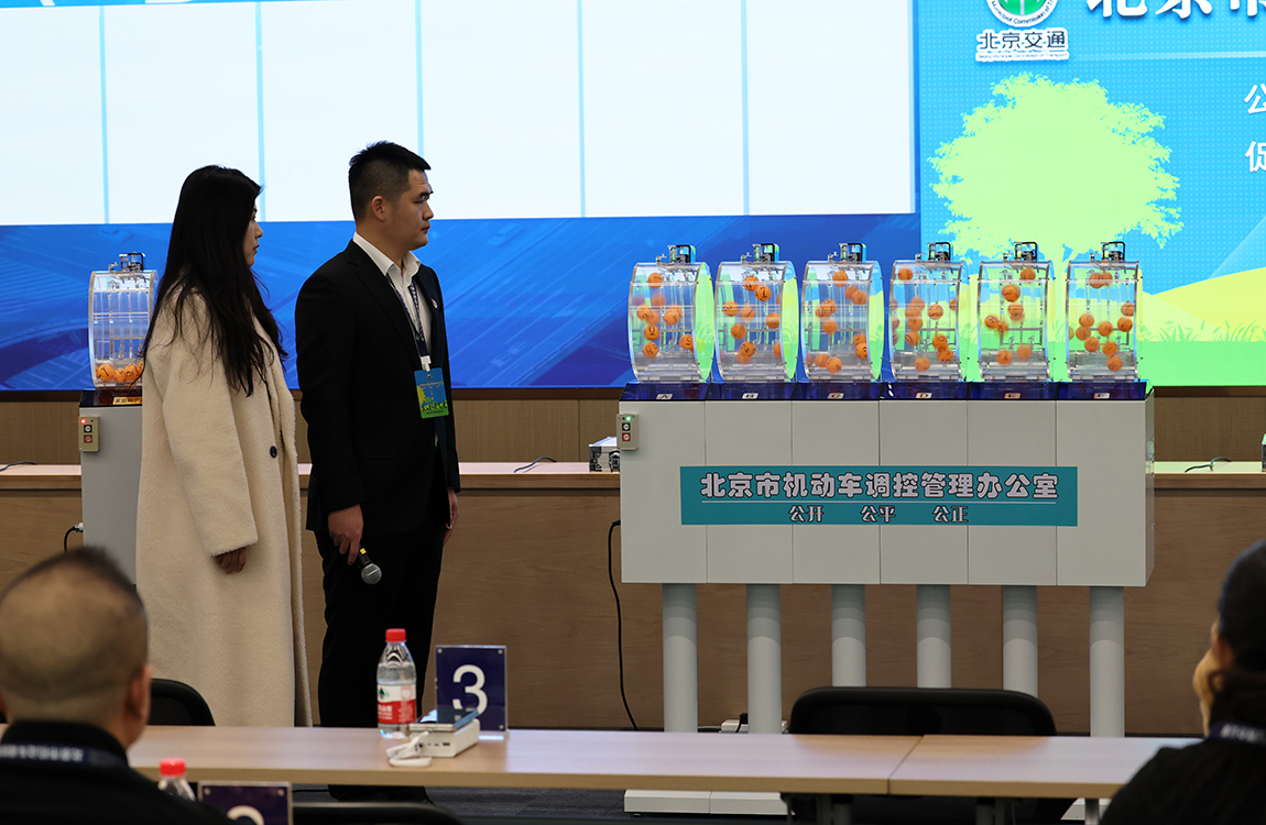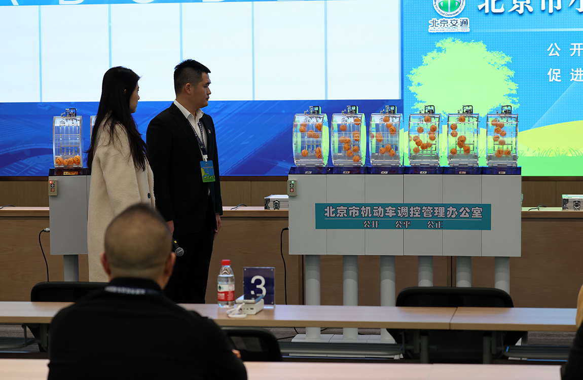 主持人:请在3号座位就坐的女士持身份证件到公证员处签名确认,因摇中的两个球号相同,将由他一人同时负责摇取“家庭和个人、单位普通小客车指标”的随机种子数。