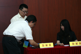 小客车摇号活动进行现场监督。根据摇号规则的规定,此前我们监督工作人员随机抽取了申请人代表,并对本期摇号所用的器具、电脑及程序、有关编码数据码数据光盘进行了测试和封存,并于今日出席了摇号现场。经我与公证人员彭頔现场监督,兹证明,事先经本处封存的本期北京市小客车指标摇号所用器具、电脑及程序、摇号编码数据光盘密封完好,运转正常,摇号过程符合预定规则,摇出的个人随机种子数为7、8、9、8、7、4,并同时由计算机产生20055个个人中签编码,摇出的单位随机种子数为1、5、2、3、8、9,并同时由计算机产生1300个单位中签编码。直以上结果真实有效。北京市国信公证处公证员马麟,2014年6月26日。谢谢大家。