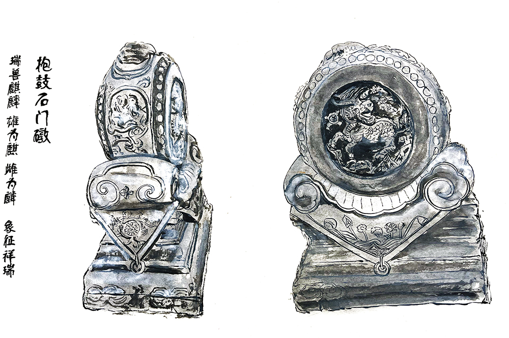 抱鼓石门礅:瑞兽麒麟,雄为麒,雌为麟,象征祥瑞,松为延年益寿。麒麟卧松加金钱、犀角、珊瑚、宝扇等民间吉祥八宝,寓意所有祝福尽在其中。(作者:陈惠展)