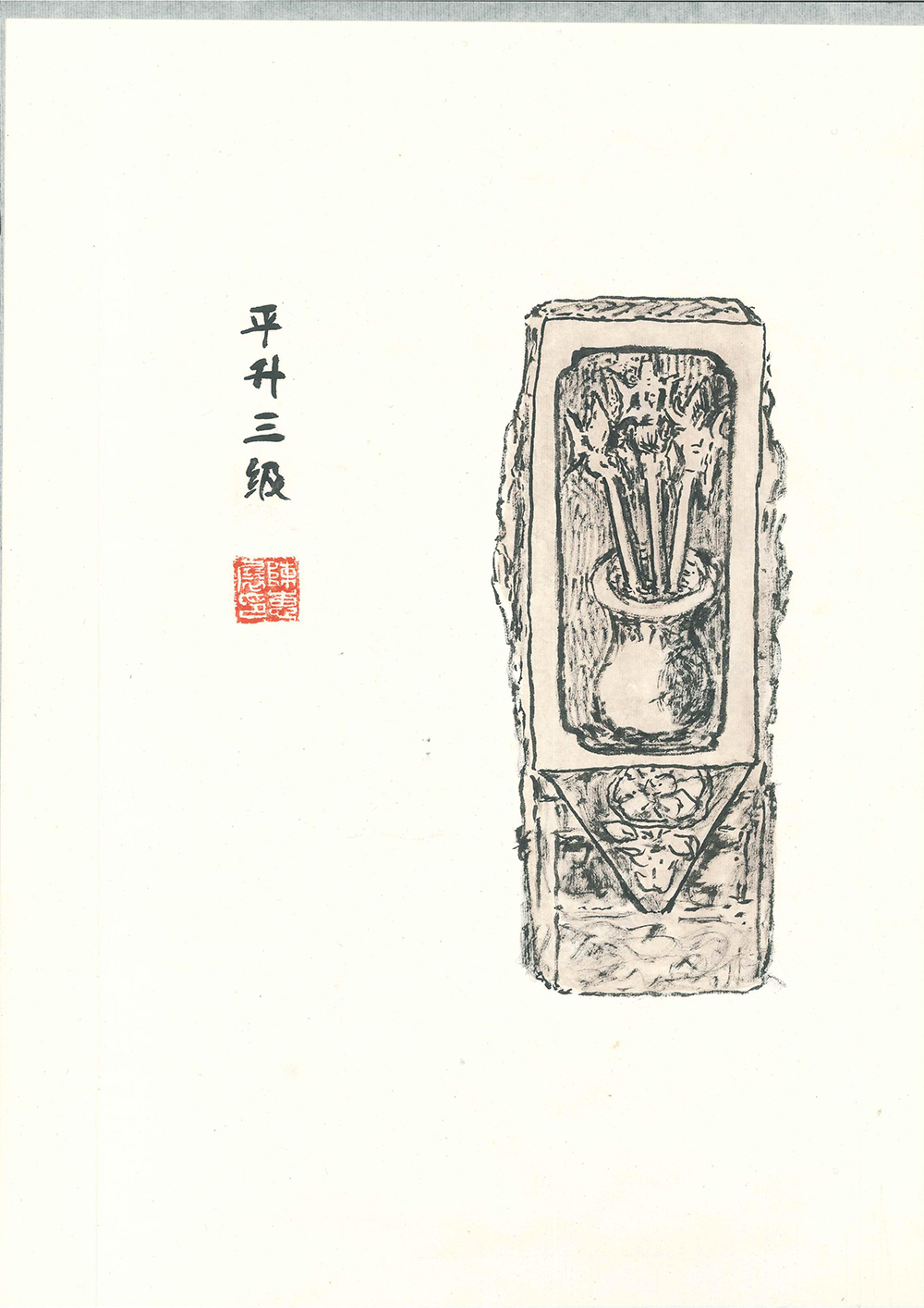 平(瓶)升三级,(瓶上插有三戟)平升三级乃表示:官运亨通,祝愿连升三级之意。(作者:陈惠展)