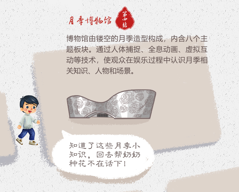 月季博物馆由镂空的月季造型构成,分为历史、科学、文化、世界等八个主题板块,将月季的历史演变过程等娓娓道来。