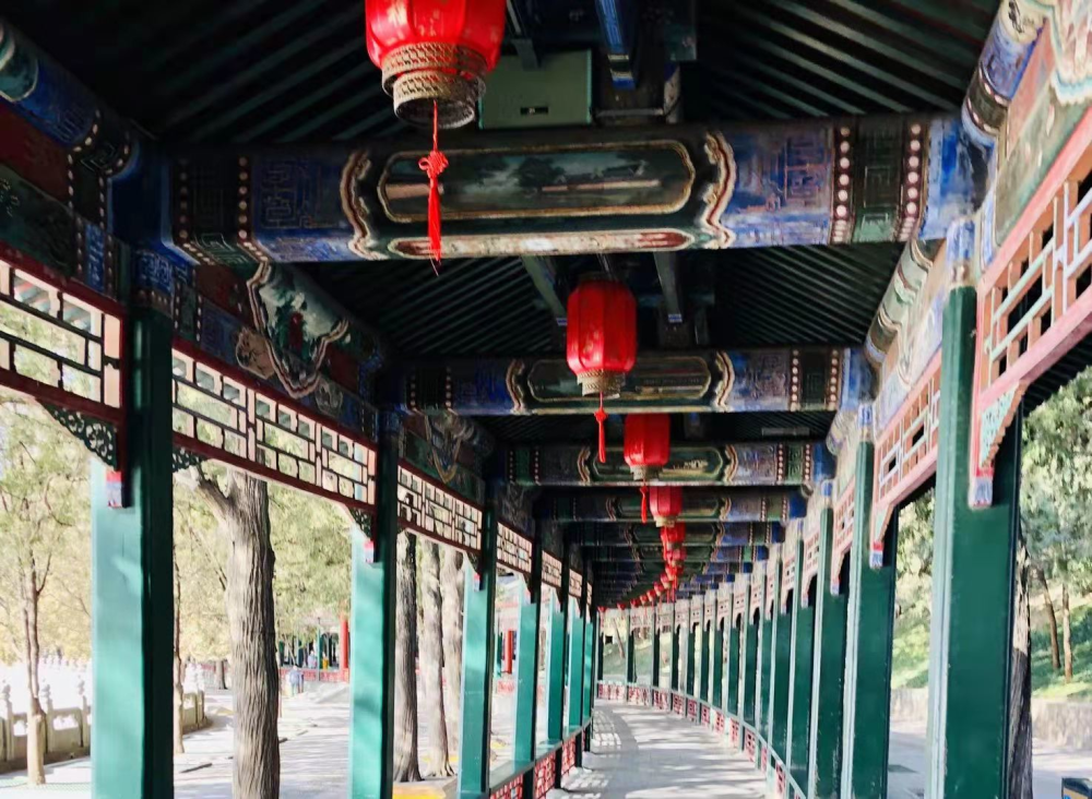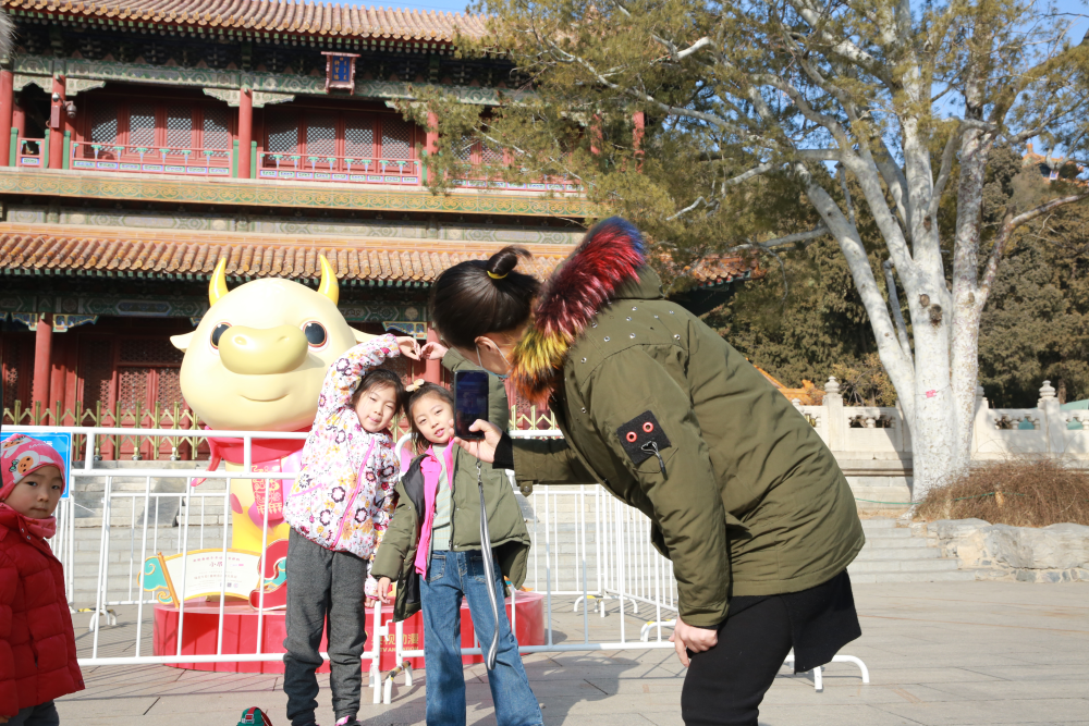 景山公园。红红的灯笼和吉祥牛,把公园装扮一新。每个角落都充满着浓浓的年味,喜迎四方客人,迎接牛念的到来。