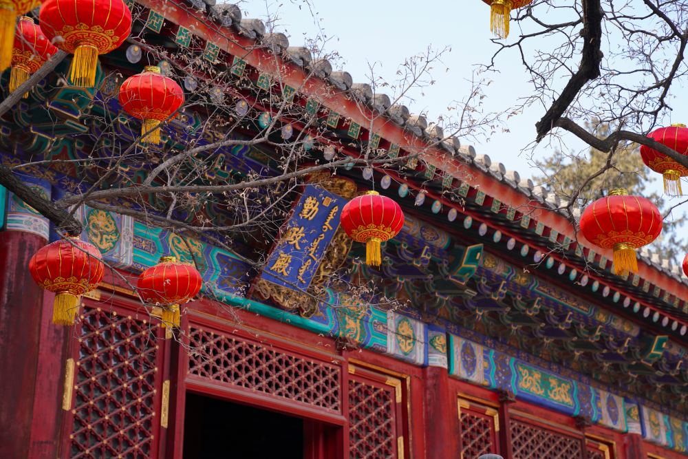 北海公园。大红灯笼高高挂起,让人来人往的游人感知诗意和情怀。与古色古香的建筑风格搭配更是相得益彰,让人不觉感受到年的原汁原味儿。