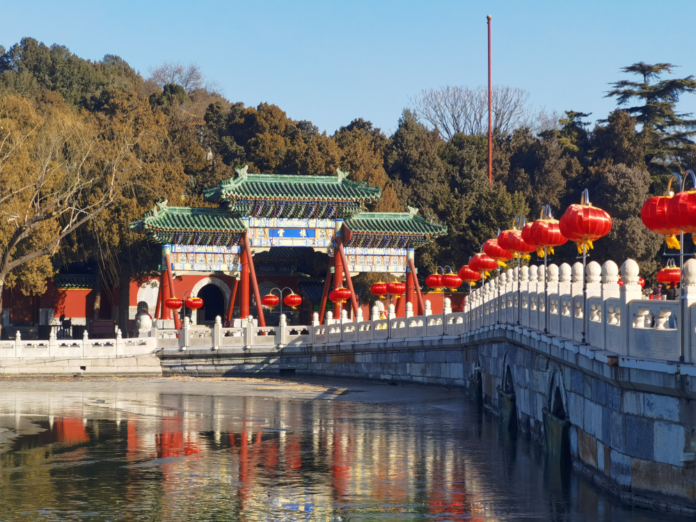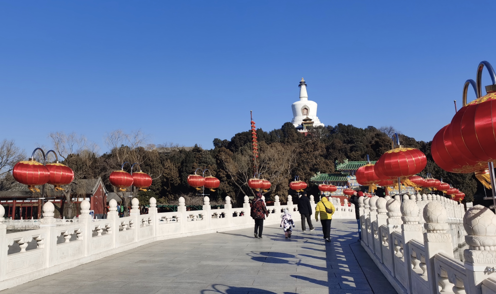 北海公园。用红色来装扮过年,承载着对新的一年万事如意的祝福。