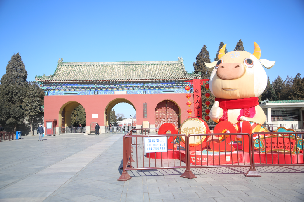天坛公园。红红的灯笼和吉祥牛,把公园装扮一新。每个角落都充满着浓浓的年味,喜迎四方客人,迎接牛念的到来。