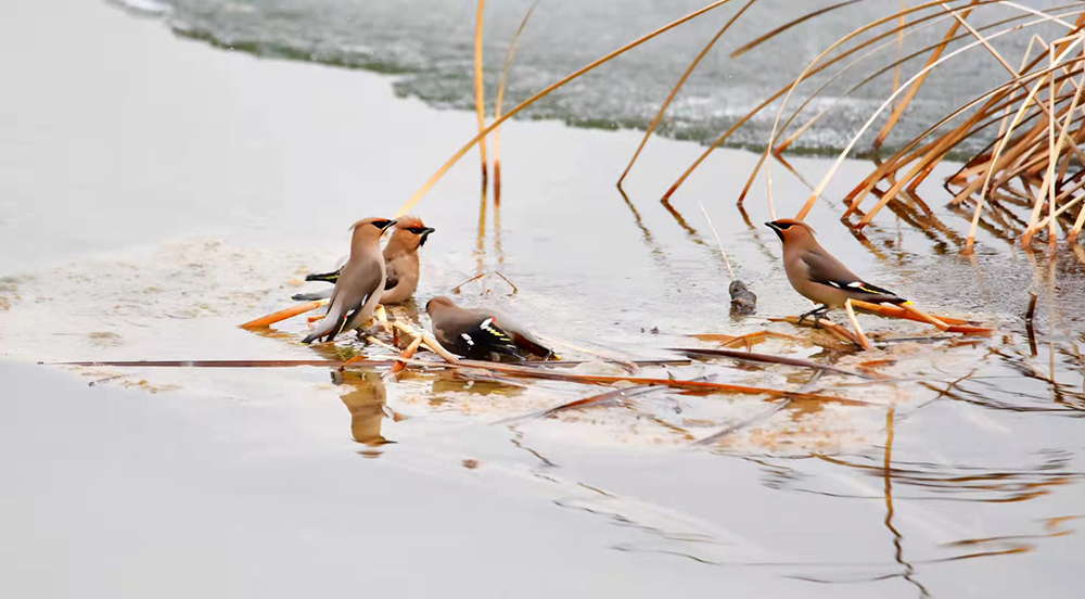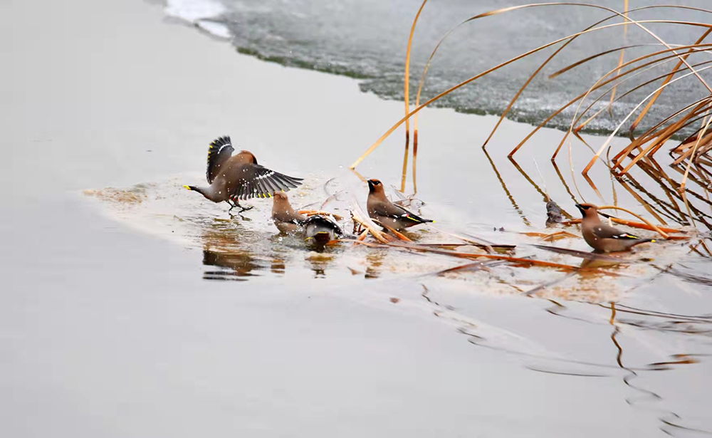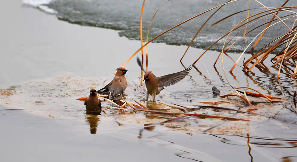 在北京密云,一群先期抵达京城的太平鸟,在池塘中嬉戏,引众多鸟类爱好者拍摄。太平鸟属小型鸣禽,体态优美、鸣声清柔,为常见冬季园林内的观赏鸟类。(摄影:云之岭)