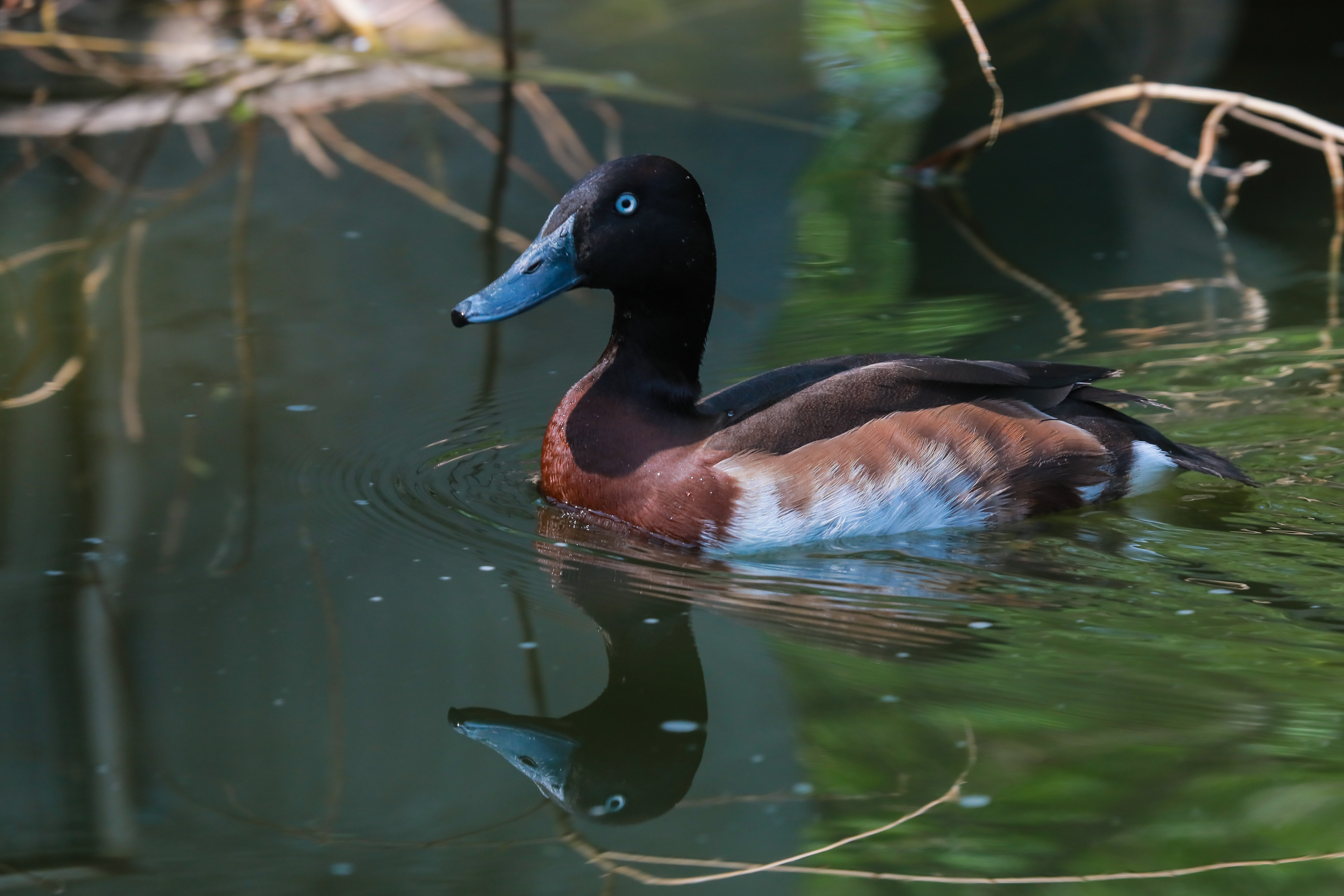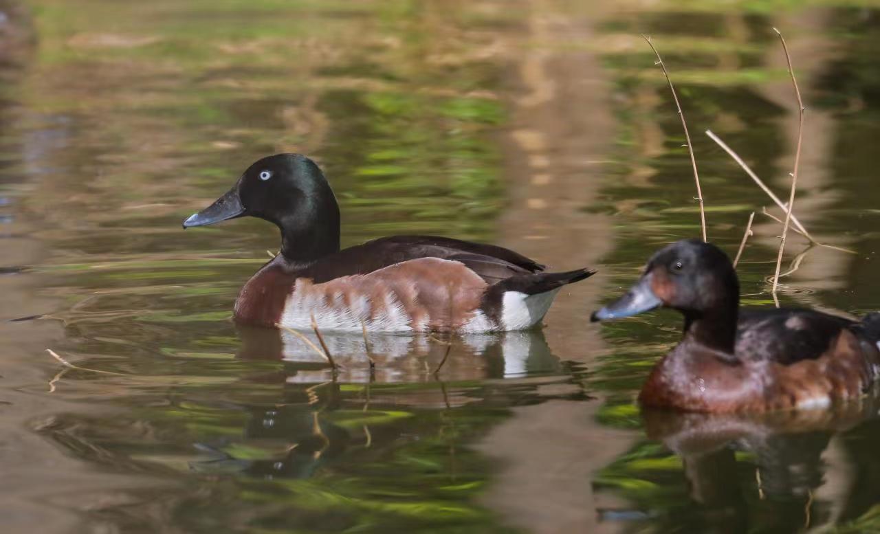 堪称“鸟中大熊猫”的青头潜鸭体圆、头大,雄性成年个体的头颈富有绿色光泽,眼眶亮白,胸腹之间白色、褐色和栗色的羽毛形成交错的花纹。