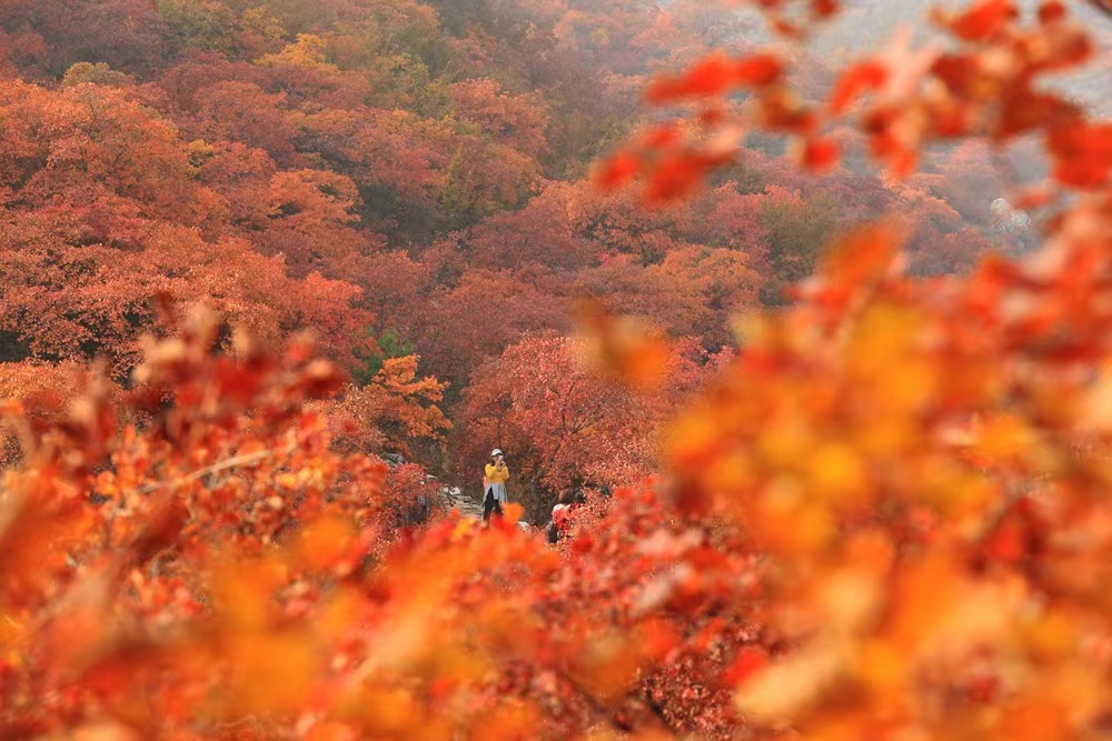 走进房山泗马沟,漫步在蜿蜒的石道,红叶随行,连绵起伏的山峦上,橙黄红绿,煞是热闹。(摄影:薛义)