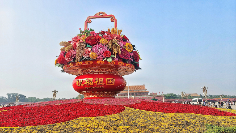 2023年9月25日,天安门广场和长安街沿线的摆花工作完工,巨型花篮和10处主题花坛正式亮相,成为市民游客新的打卡点,大家走上街头欣赏花坛,共同祝福祖国。(摄影:赵承顺)