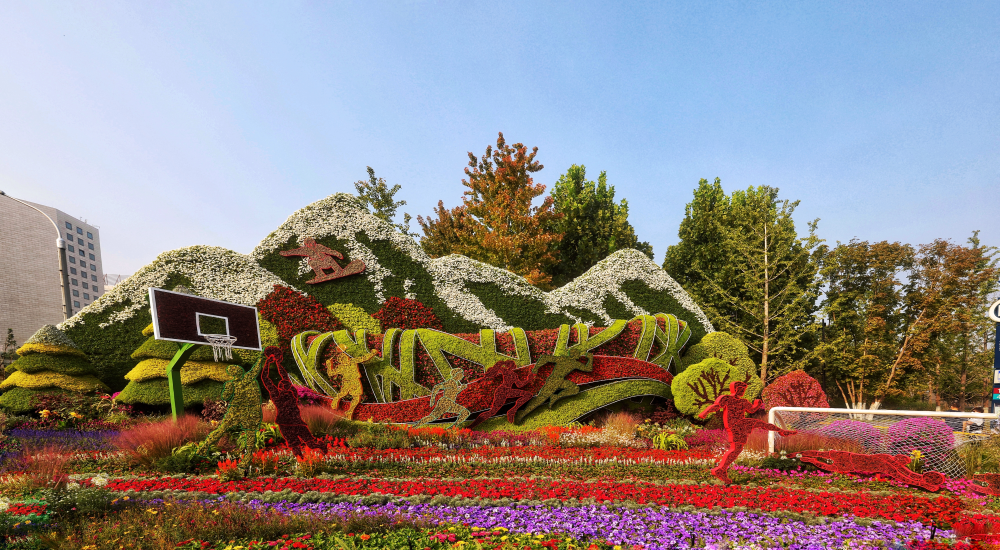 东单西北角的“和谐共生”花坛。(摄影:王越)