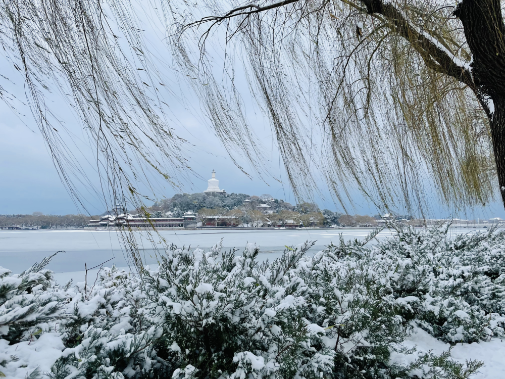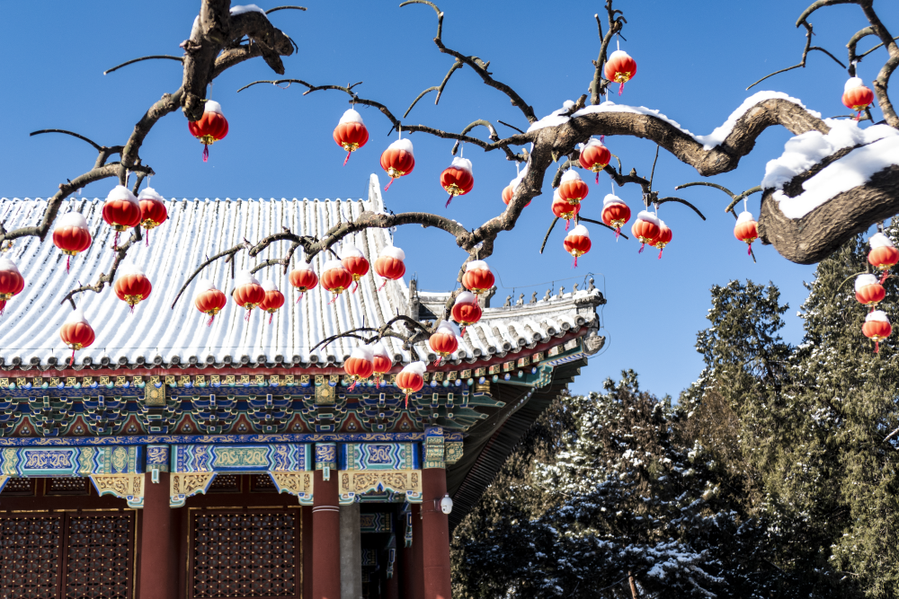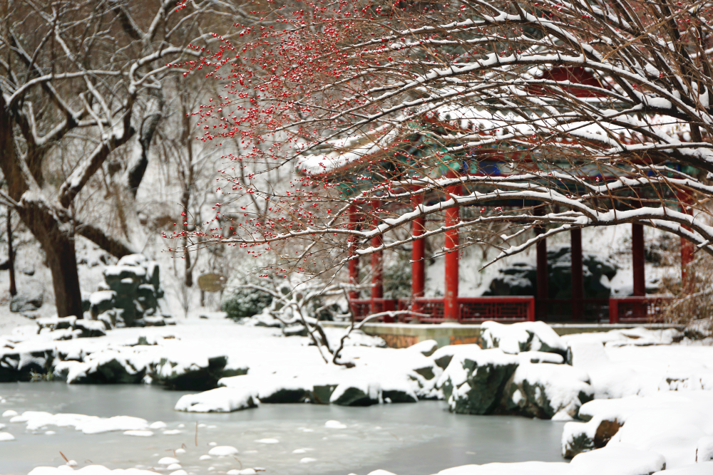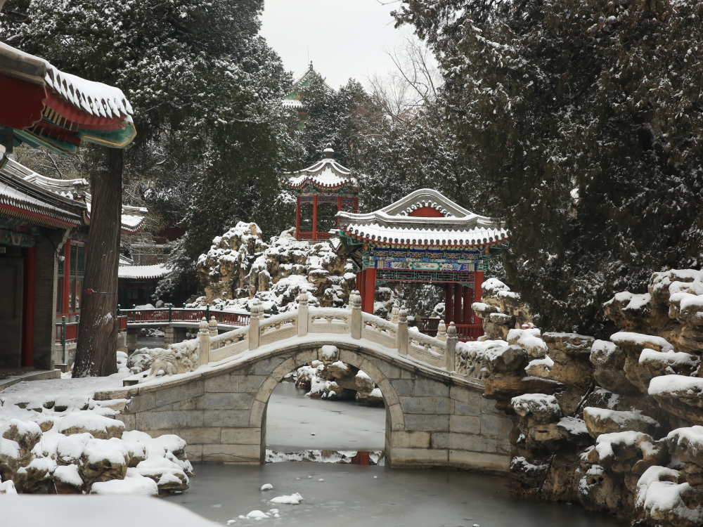 北海公园银装素裹,红墙碧瓦、古建白雪相得益彰。