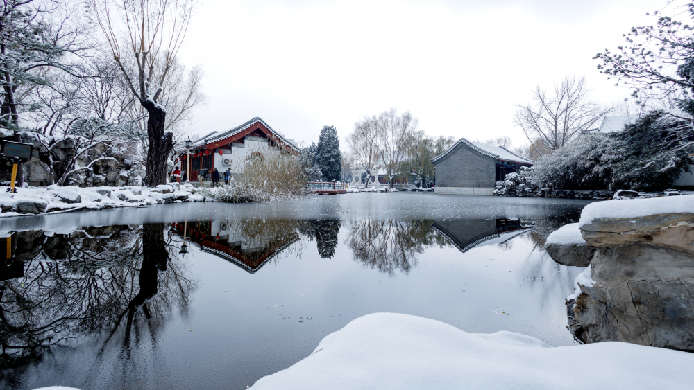 大观园银装素裹,红墙碧瓦、古建白雪相得益彰。(摄影:陈晓历)