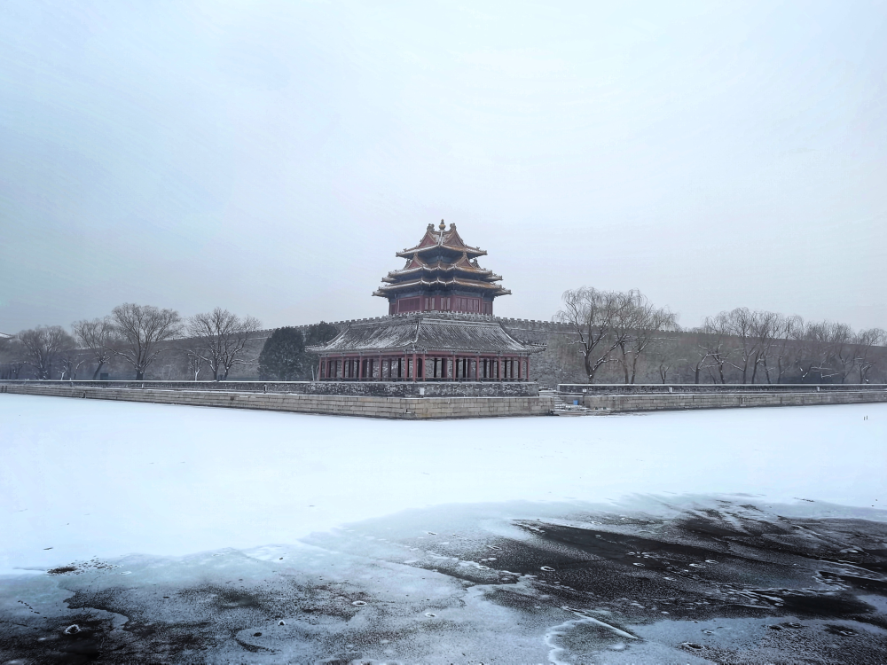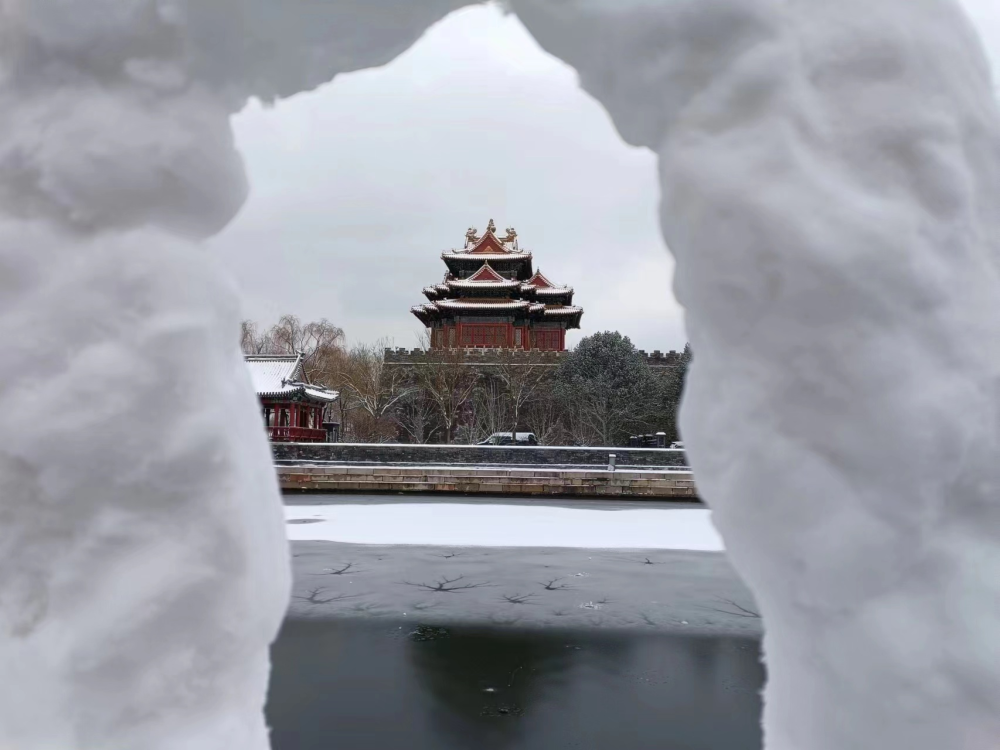 角楼银装素裹,红墙碧瓦、古建白雪相得益彰。(摄影:江孟中)