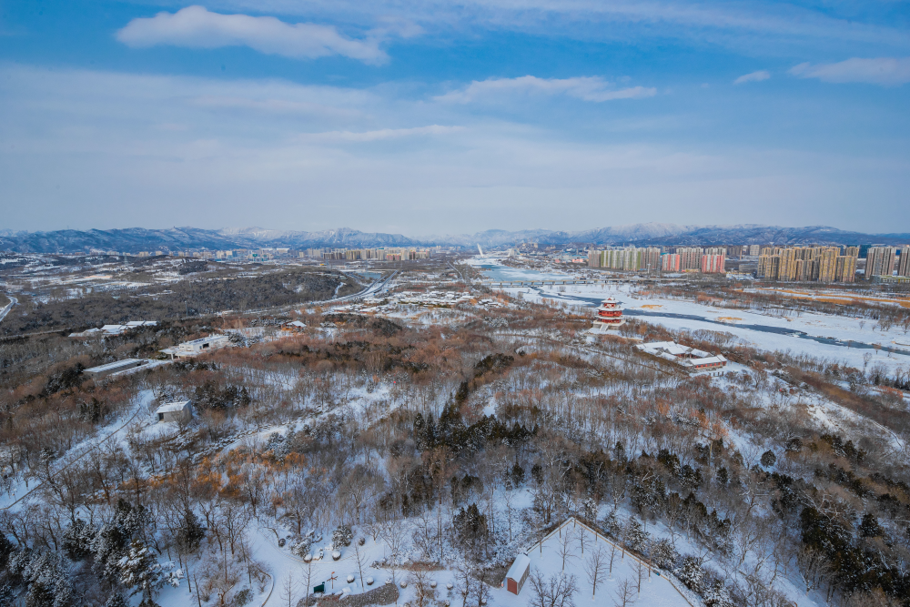 皑皑白雪笼住层林、覆盖泉面,将北京园博园装点,成宛若晶莹剔透的童话世界。