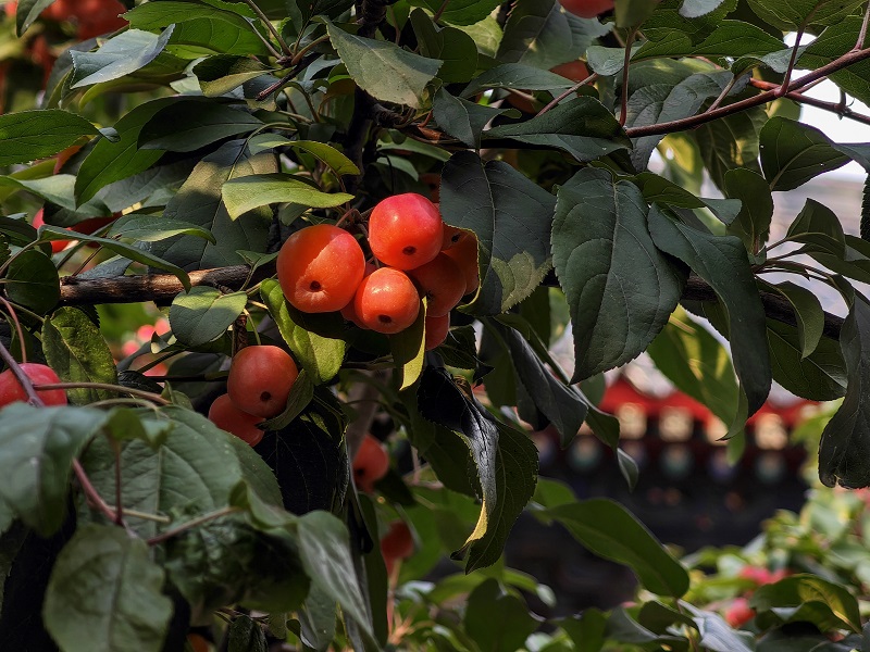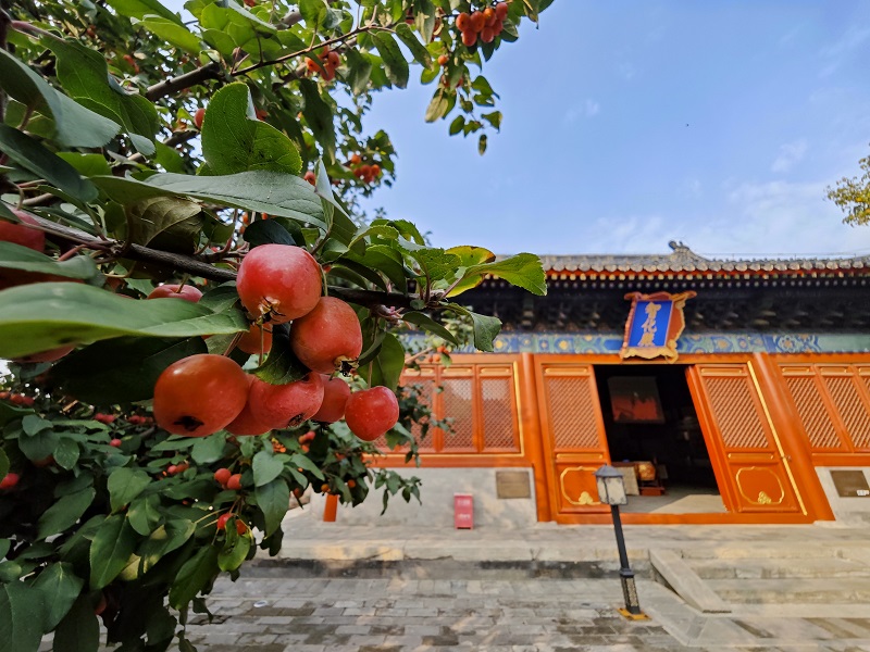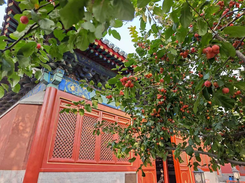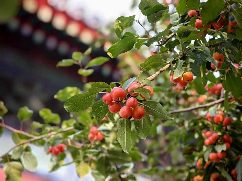 秋意已深,北京智化寺内,一抹艳丽的红点亮了古老寺庙。在古寺一隅,一株百年海棠树枝头挂满红彤彤的果实,像繁星般闪耀,为宁静的古寺添了几分绚丽。