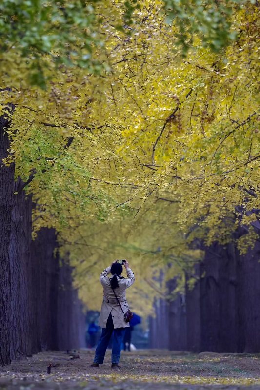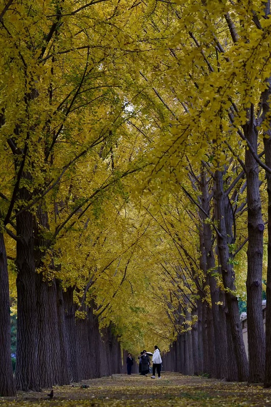 钓鱼台银杏大道被誉为北京银杏界的“天花板”,银杏耀眼而热烈,它们自由伸展同建筑、人群一同构成了一幅斑斓的彩色画卷。近百米长的银杏枝叶交织成金色穹顶,落叶铺就的“金色地毯”。漫步其上,仿佛走入一条金叶编织的隧道,穿越进童话世界。