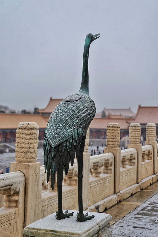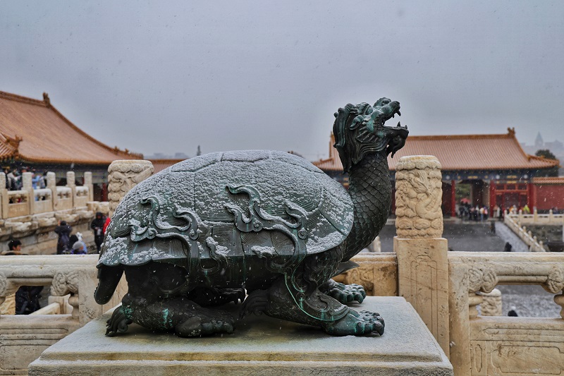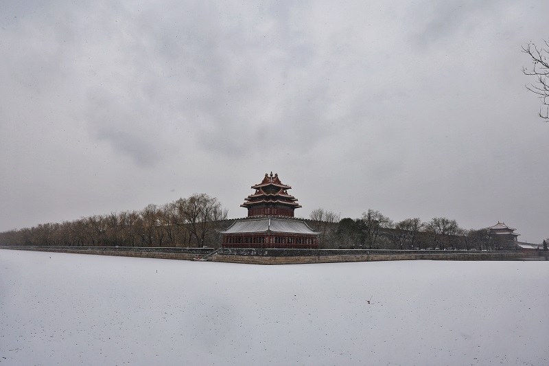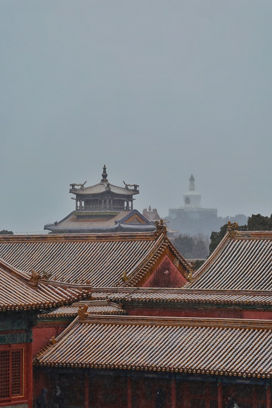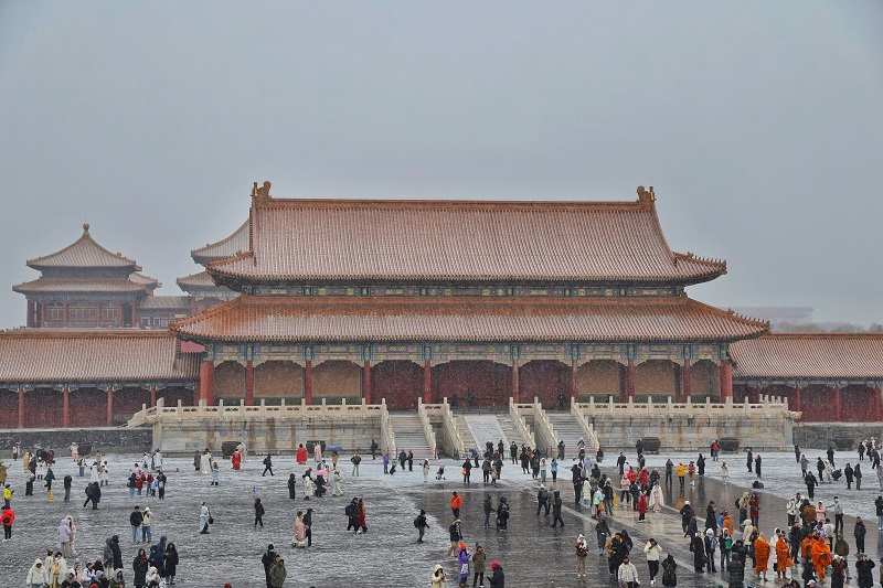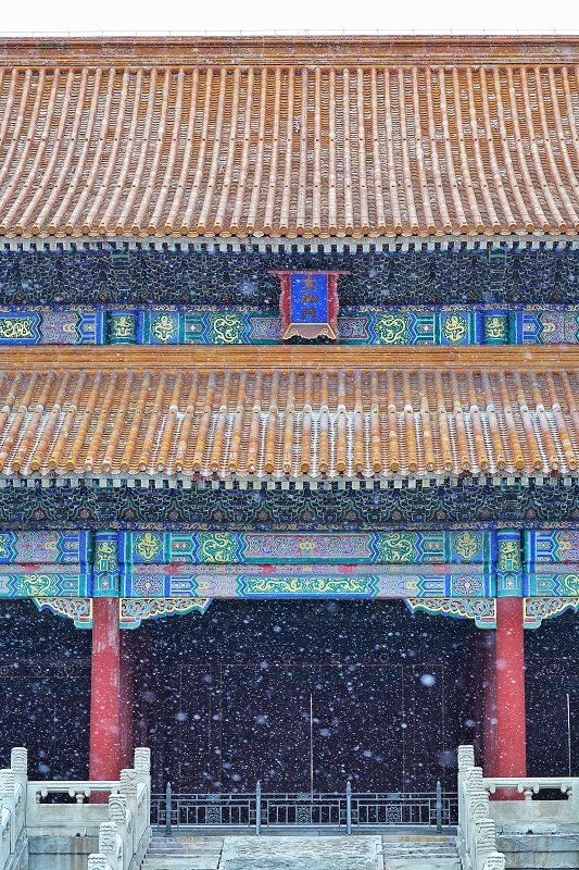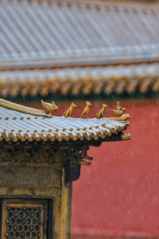 雪中的故宫,处处都像取景框。雪轻柔地落在琉璃瓦上,为那金黄添上一抹纯净的白,宛如给古老的宫殿戴上了柔软的毡帽。宫墙巍峨,在雪幕中更显庄重。