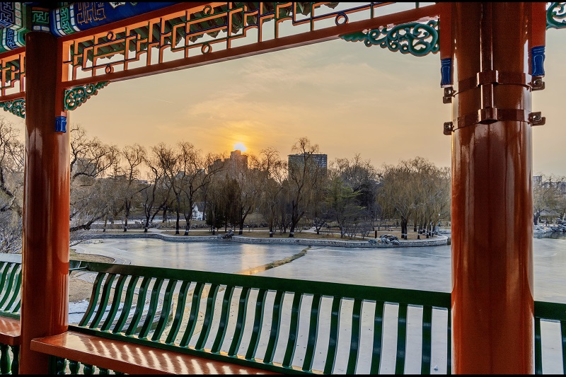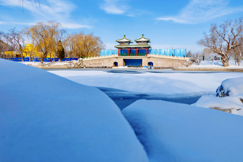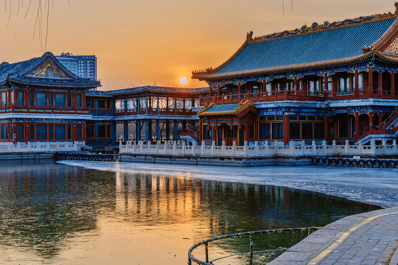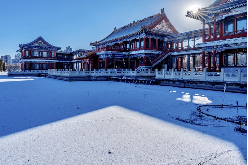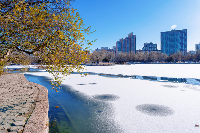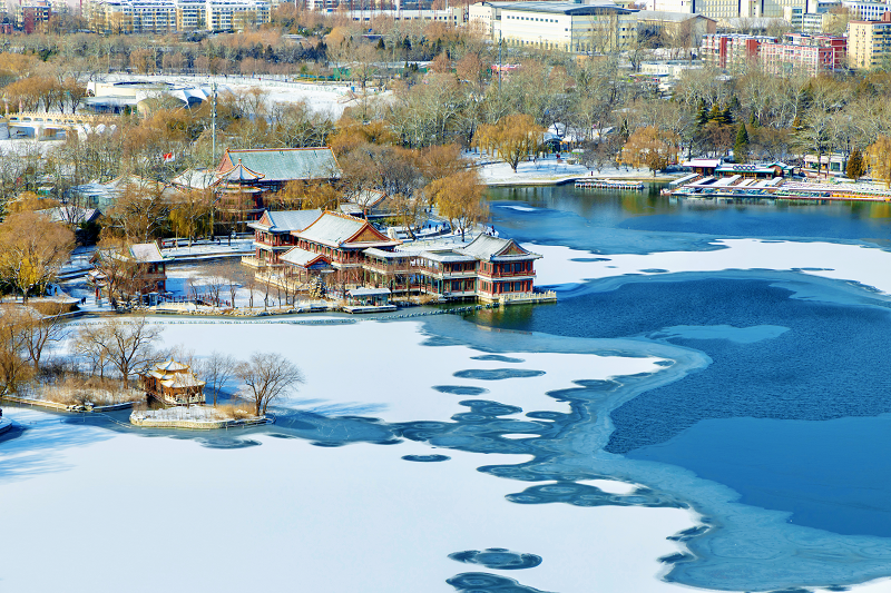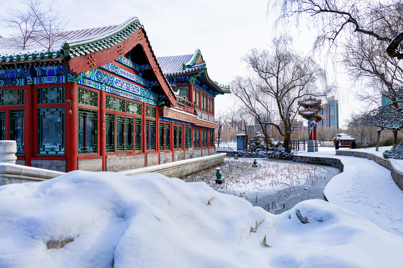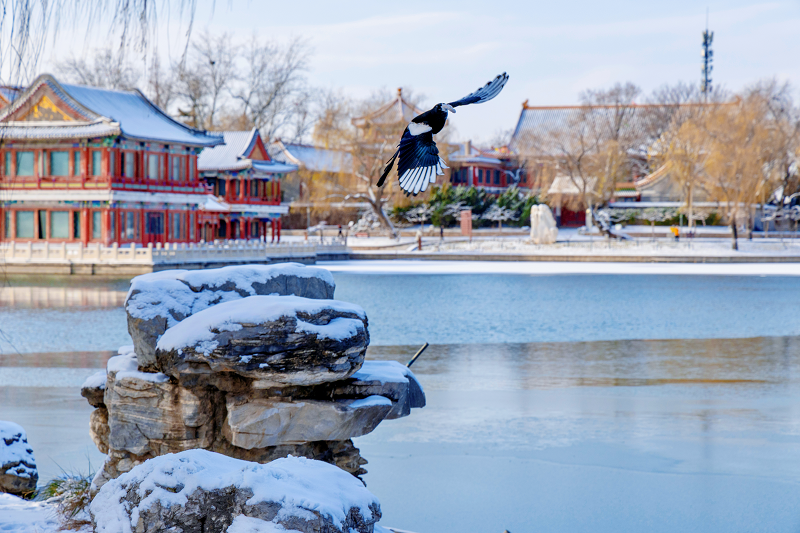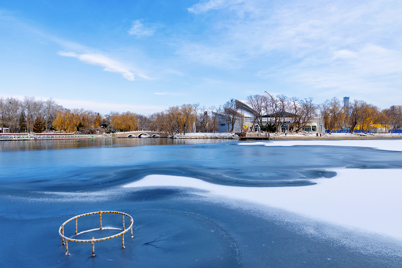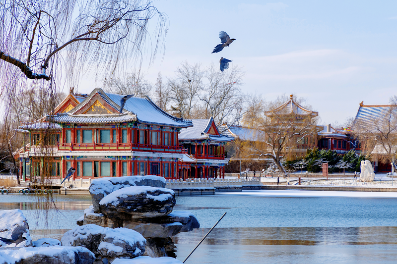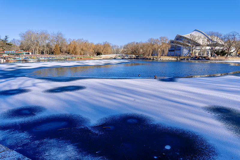 冬日的龙潭湖宛如一幅诗画,残荷枯枝与古建相映成趣。近岸处凝结的薄冰如通透银边,湖中央未完全封冻的水域泛着粼粼波,水禽在此间嬉戏,静谧与喧闹交织,尽显冬日独特魅力。