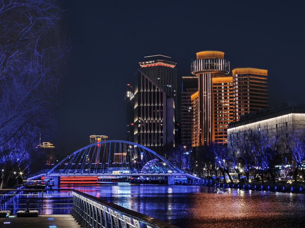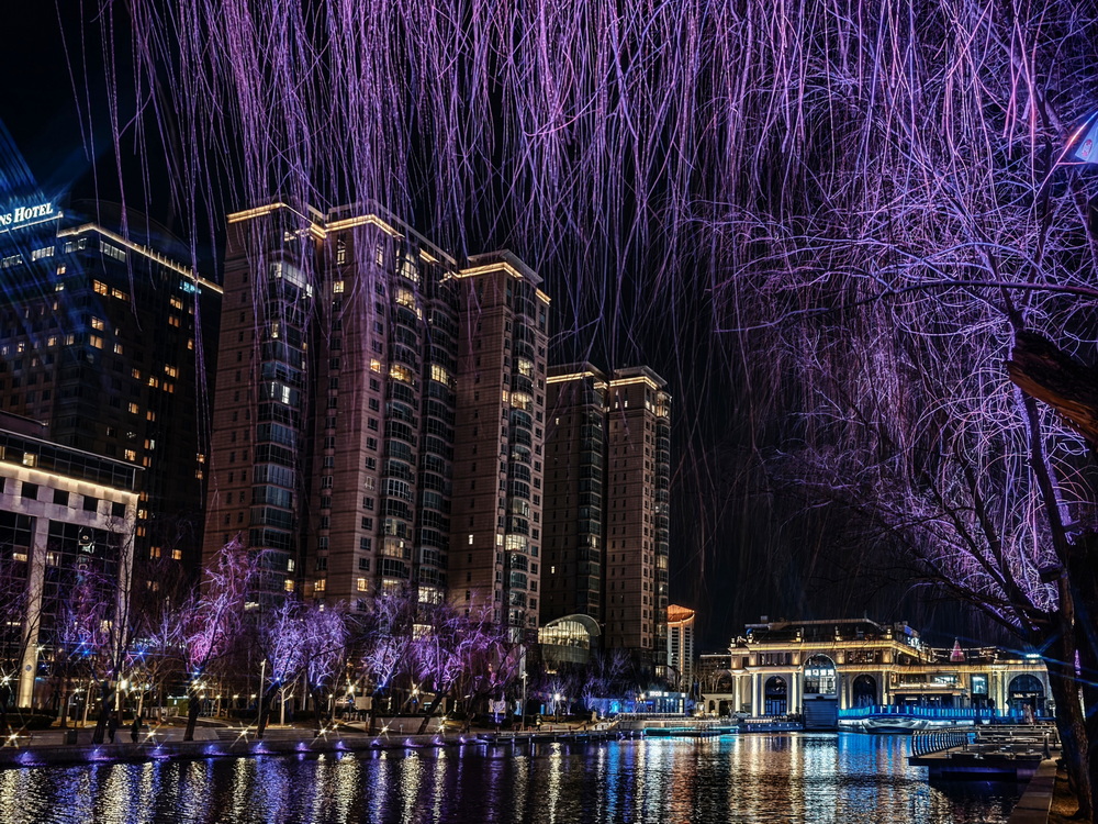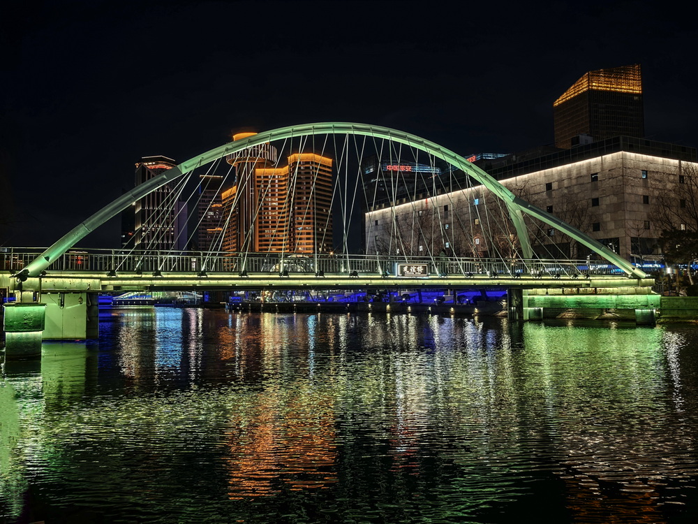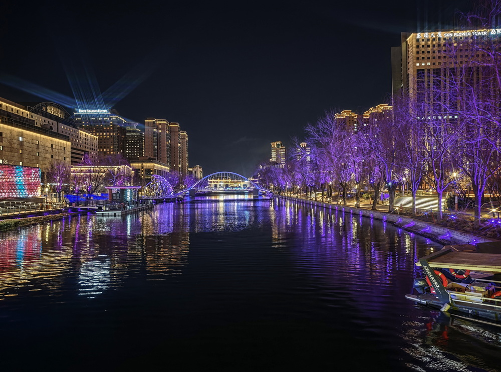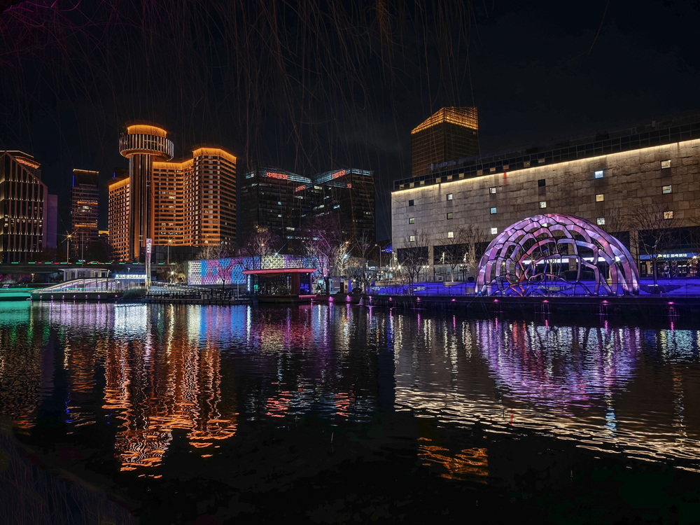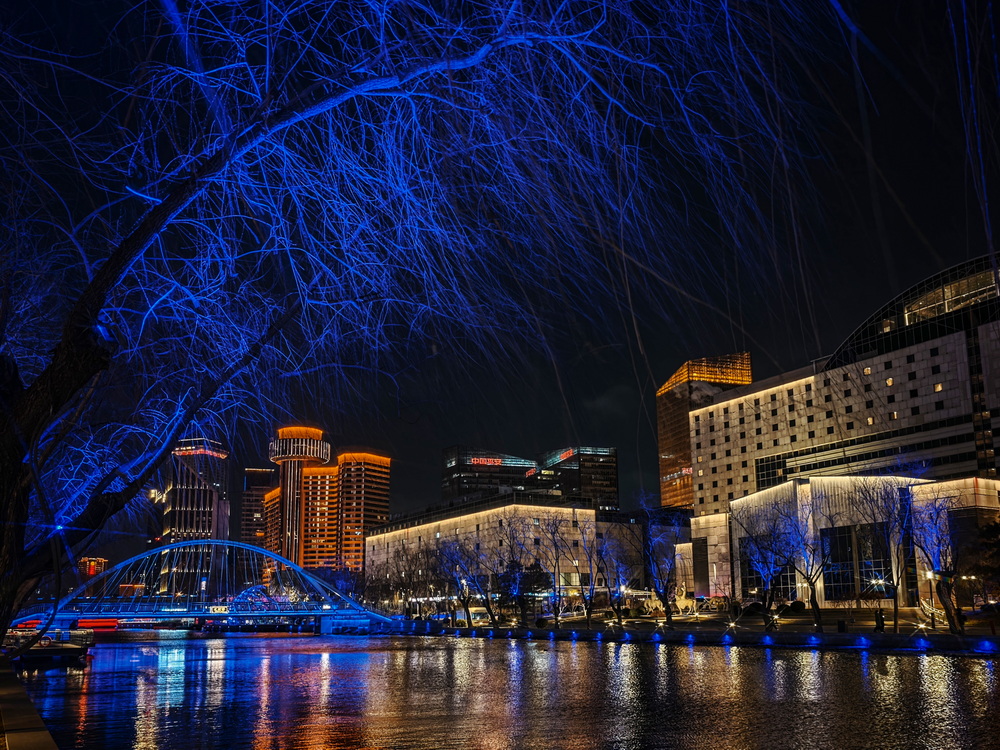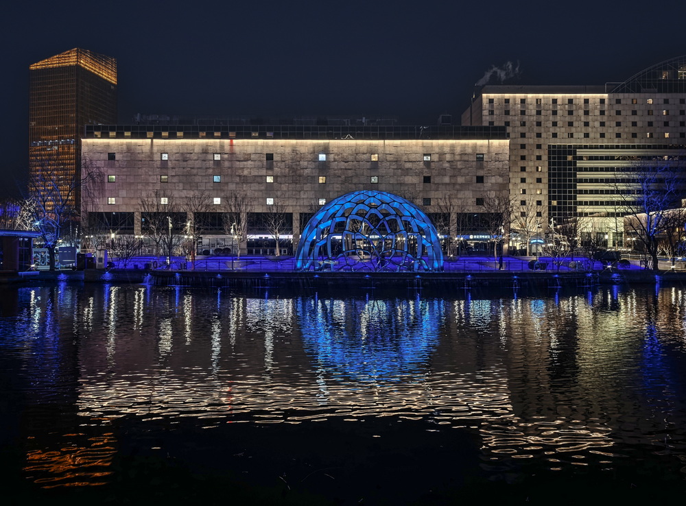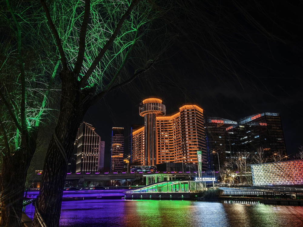 冬夜的风裹着凉意掠过亮马河,却吹不灭满河的璀璨。岸边的灯带似凝固的星河,沿着河道蜿蜒舒展,暖黄与银白交织着,把周边建筑的轮廓晕成朦胧的剪影。偶尔有行人裹紧围巾驻足,手机镜头对准河面,想留住这冬夜独有的光影。