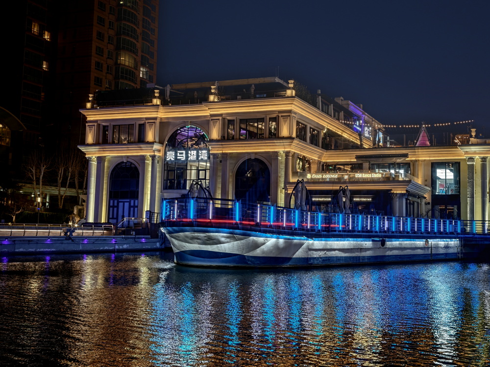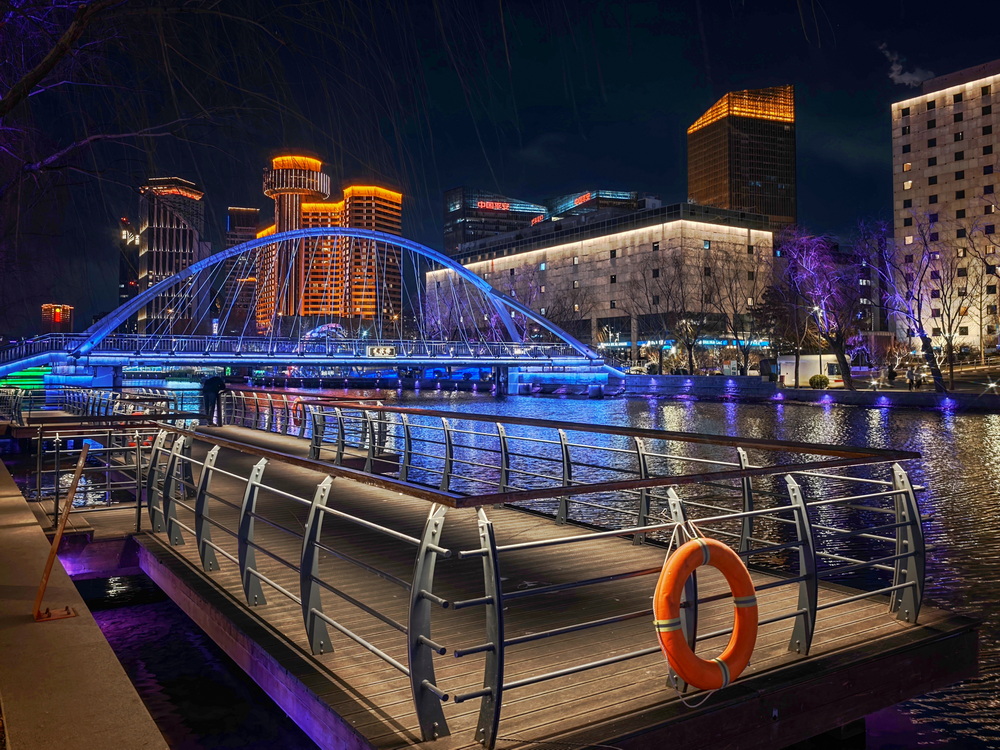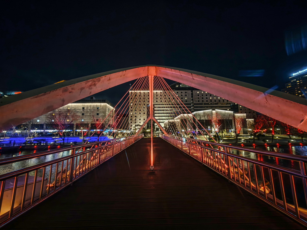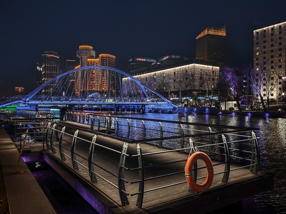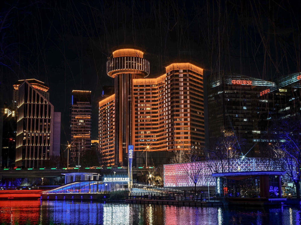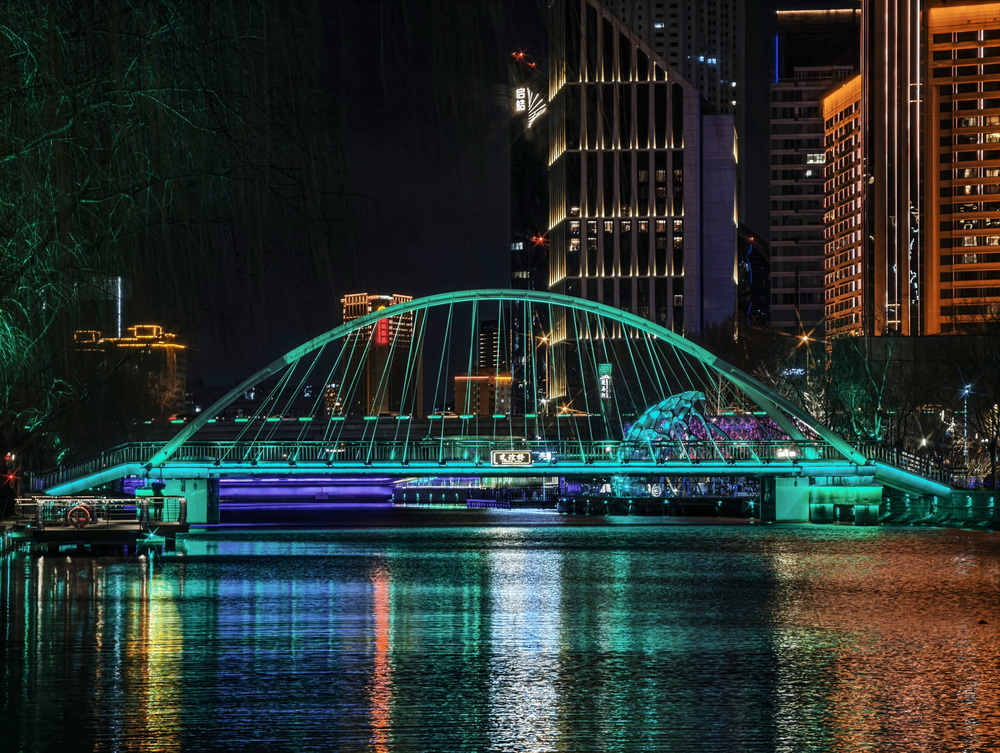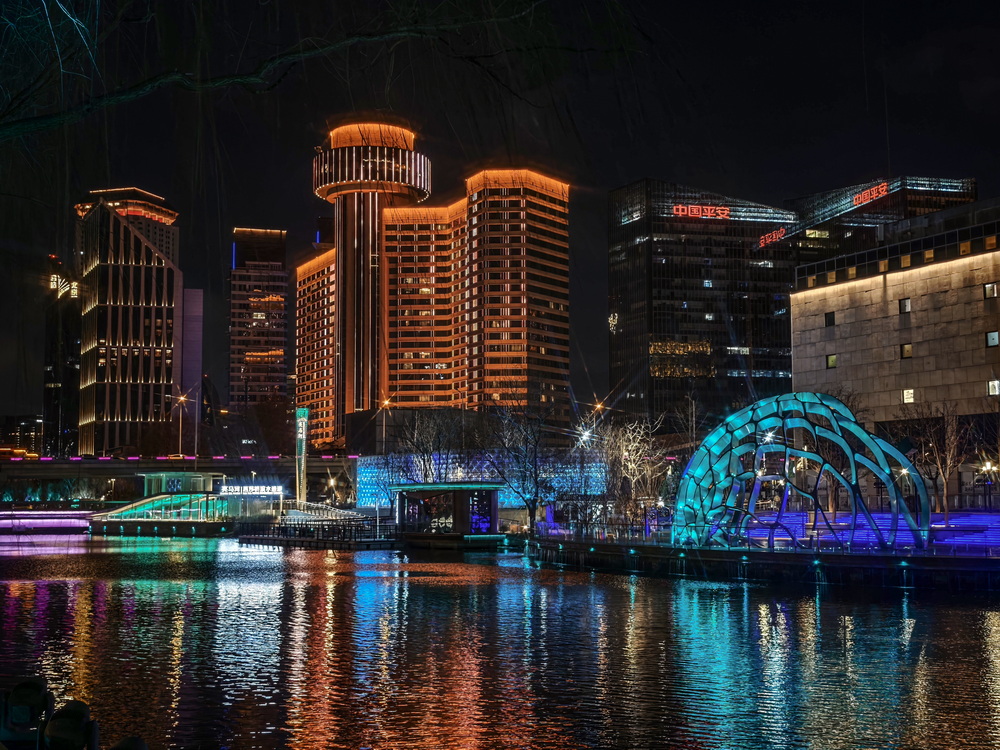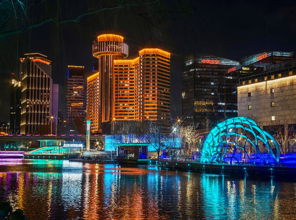 冬夜的风裹着凉意掠过亮马河,却吹不灭满河的璀璨。岸边的灯带似凝固的星河,沿着河道蜿蜒舒展,暖黄与银白交织着,把周边建筑的轮廓晕成朦胧的剪影。偶尔有行人裹紧围巾驻足,手机镜头对准河面,想留住这冬夜独有的光影。