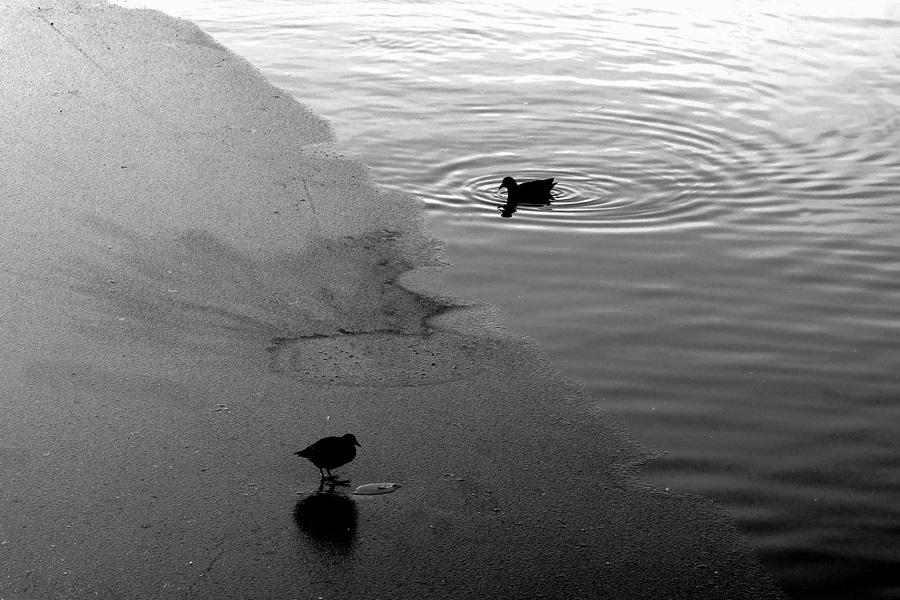 《冰湖上的故事》利用对角线构图,和明与暗的对比讲述念坛公园两只水鸟的故事。(摄影:李有明)