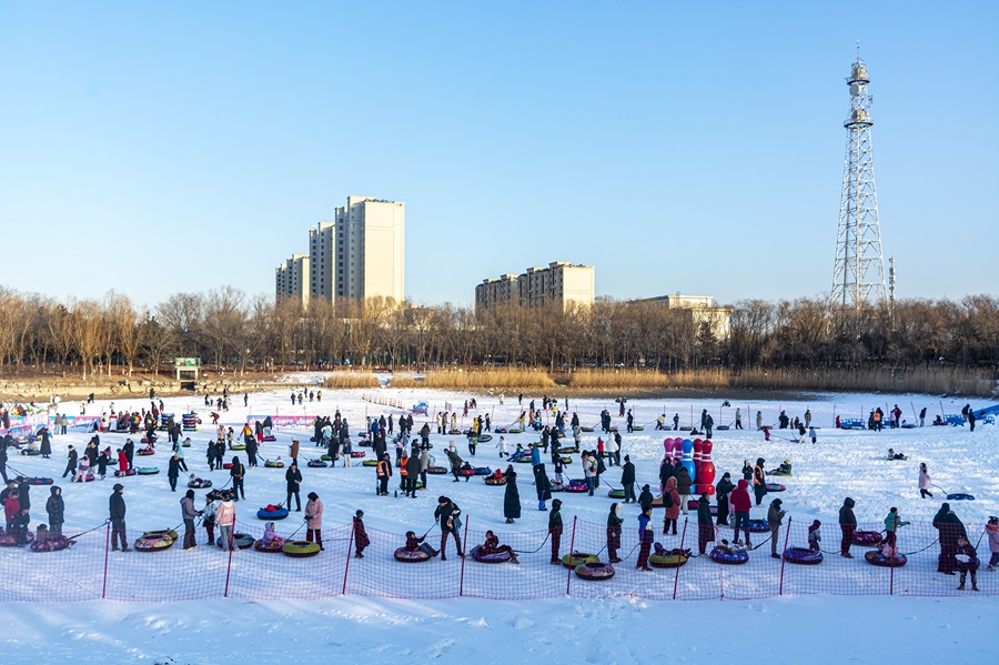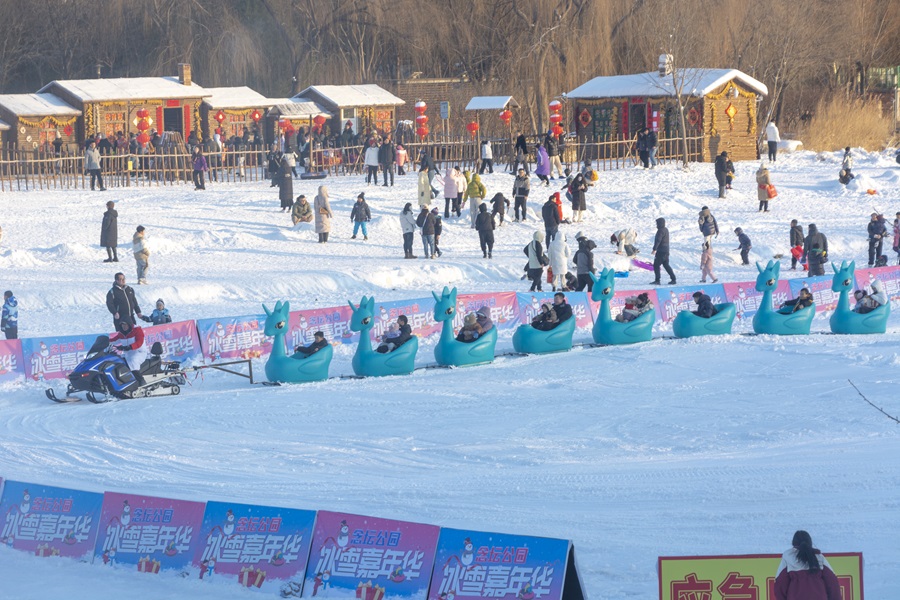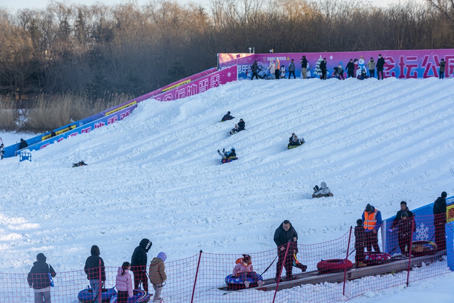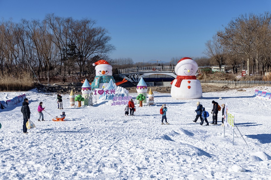 《念坛冰雪嘉年华》念坛公园巨型雪人玩偶与游玩的人群相映成趣,市民在家门口尽享冰雪乐趣。(摄影:崔慧兰)
