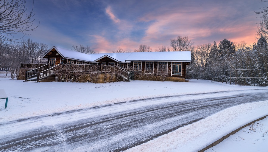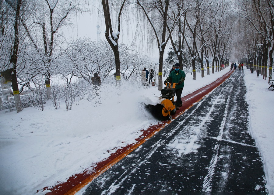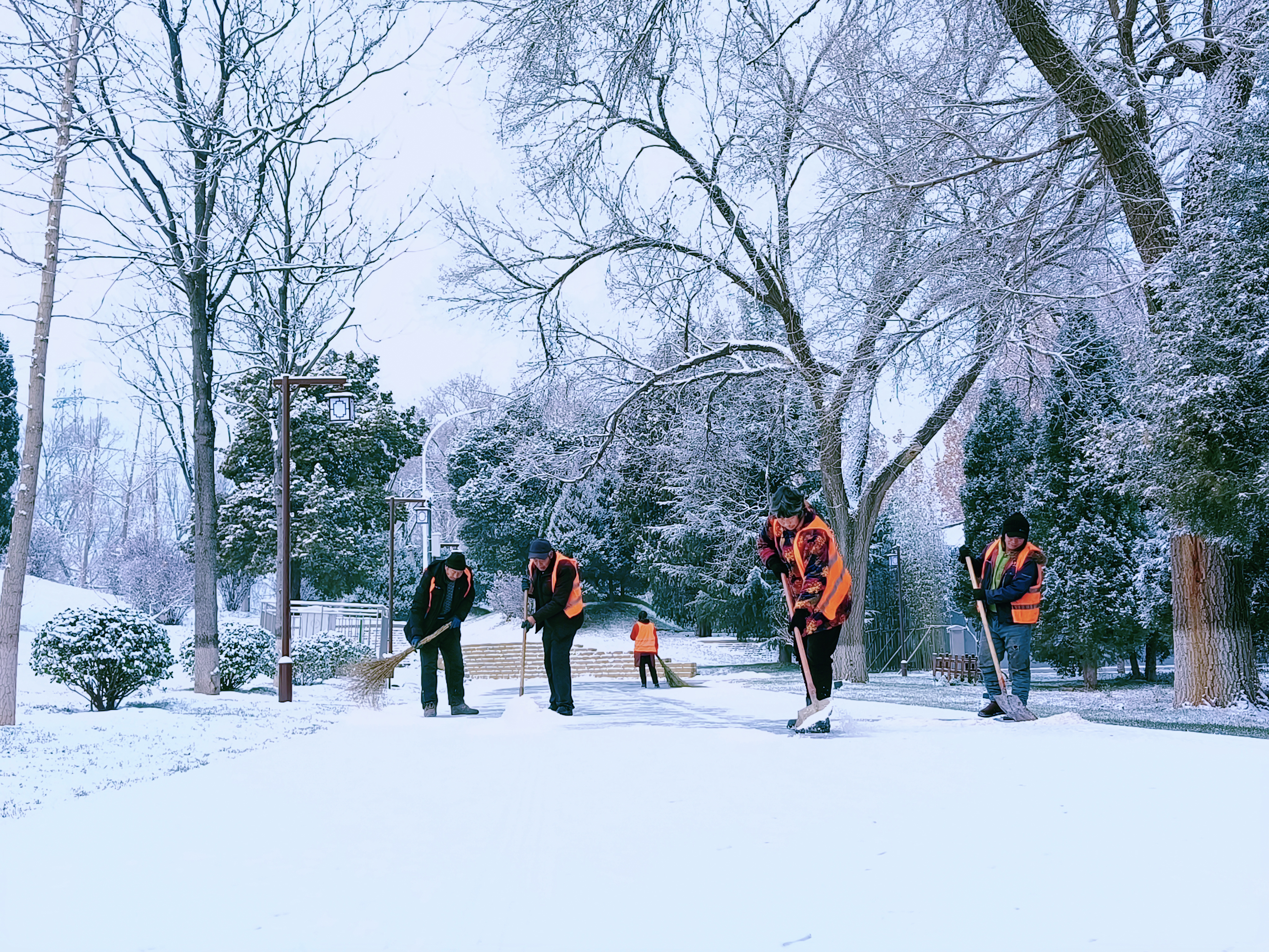 《除雪》早晨雪一停,念坛职工及时铲雪。(摄影:杨银发)