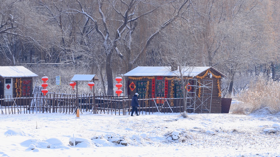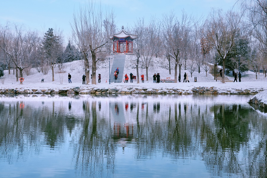 《雪湖映亭,人入画中》雪后湖畔,红亭、人影与碧水相映成趣。(摄影:崔慧兰)