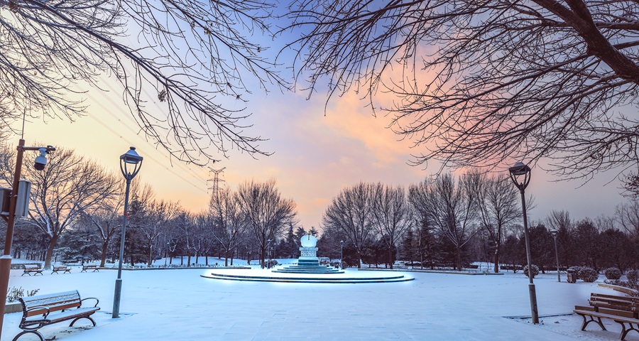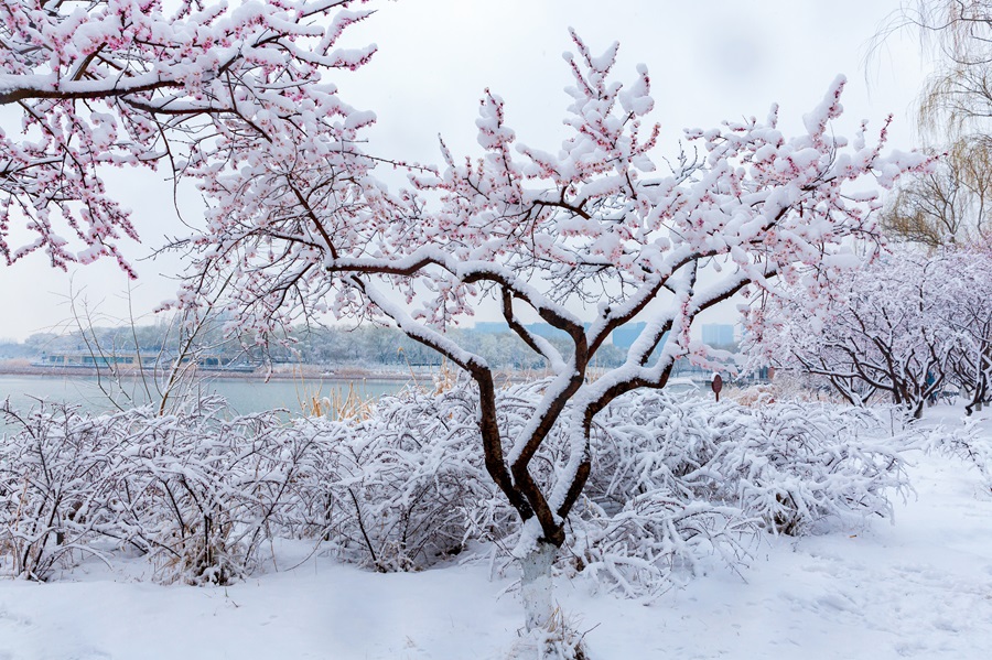 《雪后念坛》念坛公园大地、树梢、湖面覆盖大雪,好一派北国风光的感觉。(摄影:杨银发)