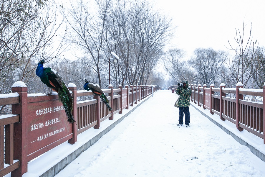 《雪桥雀影》覆雪的木质廊桥上孔雀停落,引人驻足,冬日里的浪漫邂逅。(摄影:张俊荣)