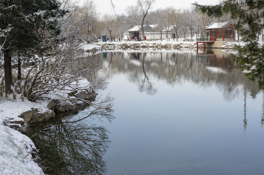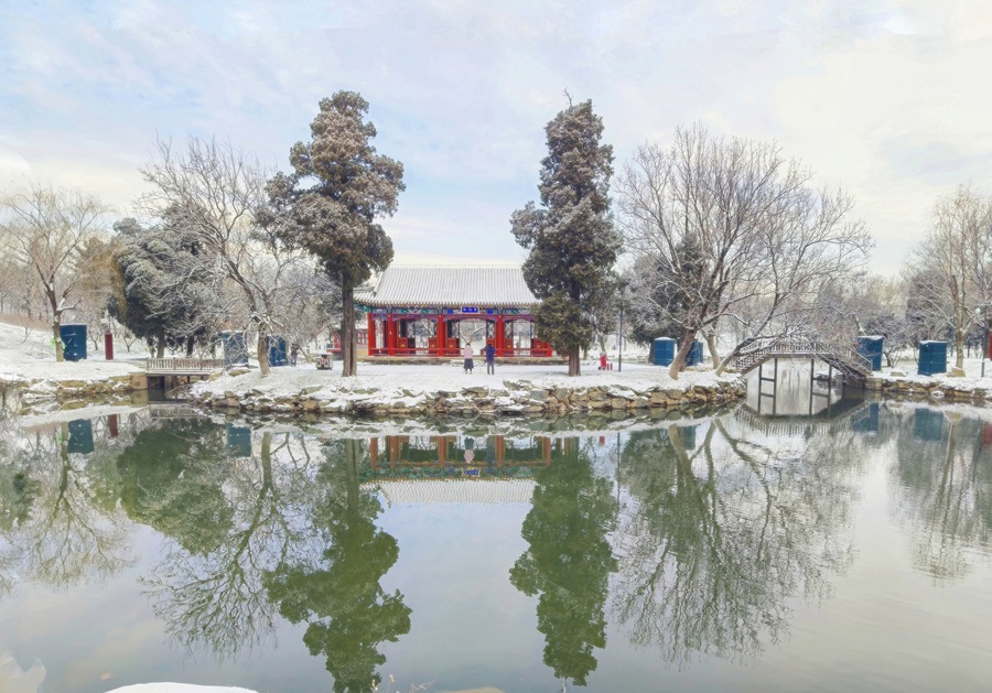《晴雪园林》团河行宫的湖水之上,雪挂枝头、红轩临水,倒影交织出冬日园林的温婉景致。(摄影:崔慧兰)