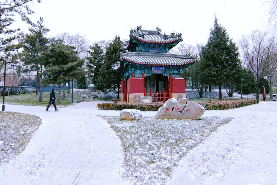 《雪径御碑亭》御碑亭矗立在覆雪的园景中更显古朴。(摄影:崔慧兰)