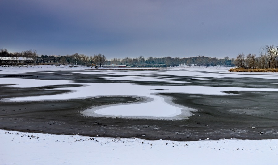 《自然画卷》雪落在南海子的湖面上形成了美丽景观。(摄影:陈明)