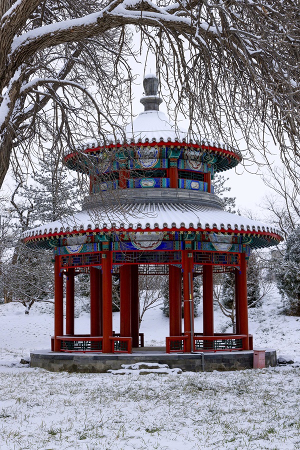 《雪覆行宫》朱红亭檐与素白雪景相映,枝桠疏朗勾勒出行宫冬韵。(摄影:崔慧兰)