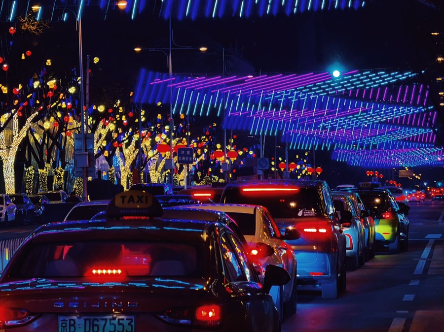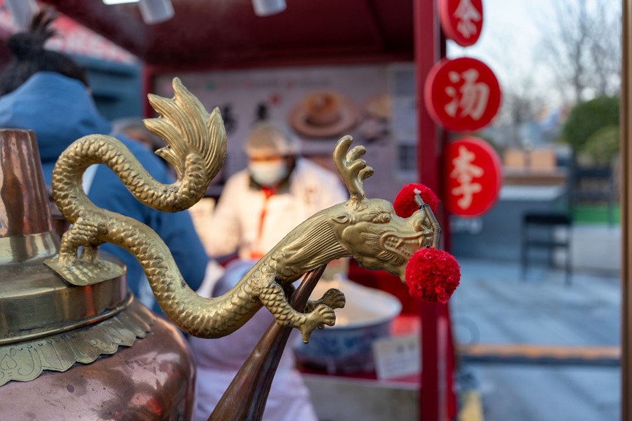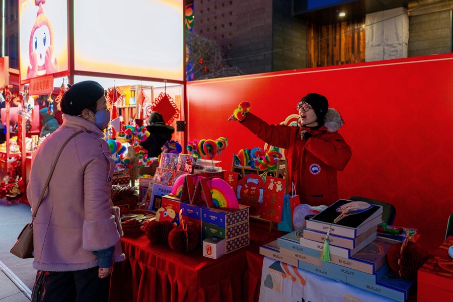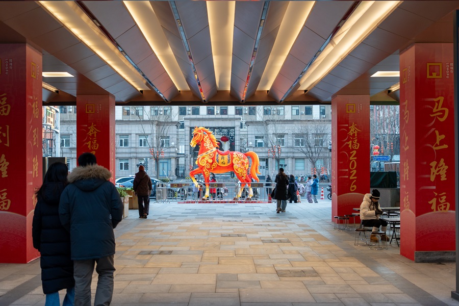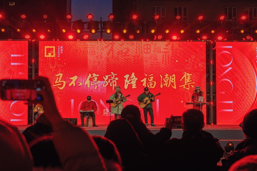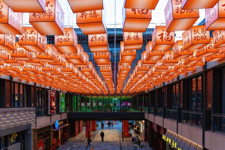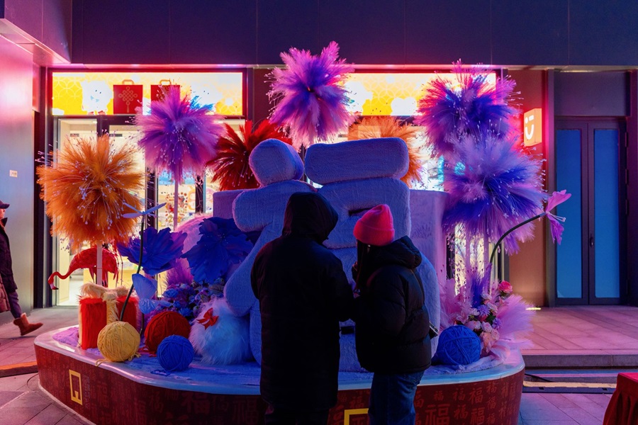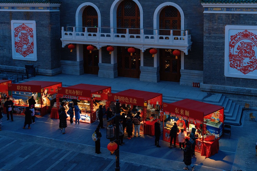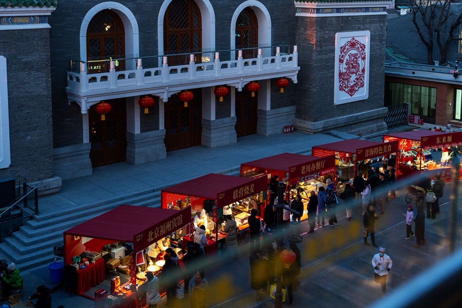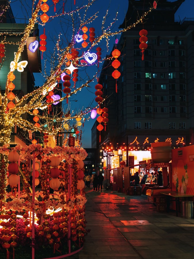隆福寺商圈内,树木被柔和的灯光点亮,与多元灯光装置交相辉映,营造出温暖而浪漫的街区氛围。市集汇聚了非遗技艺、爆款文创、国潮年货以及美食小吃等各具特色的摊位,为市民游客献上年味满满的盛宴。
