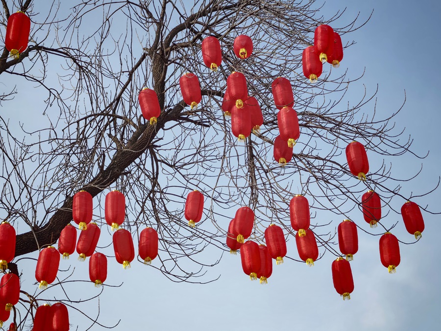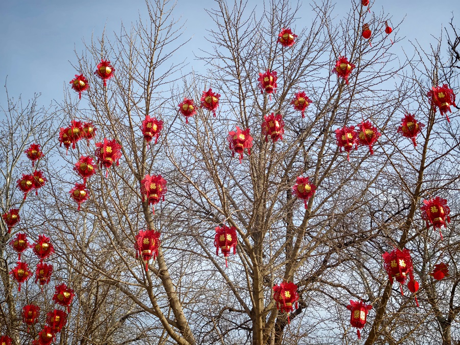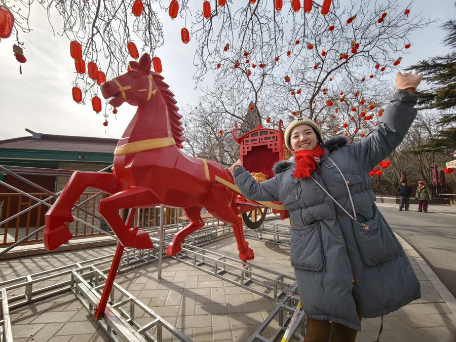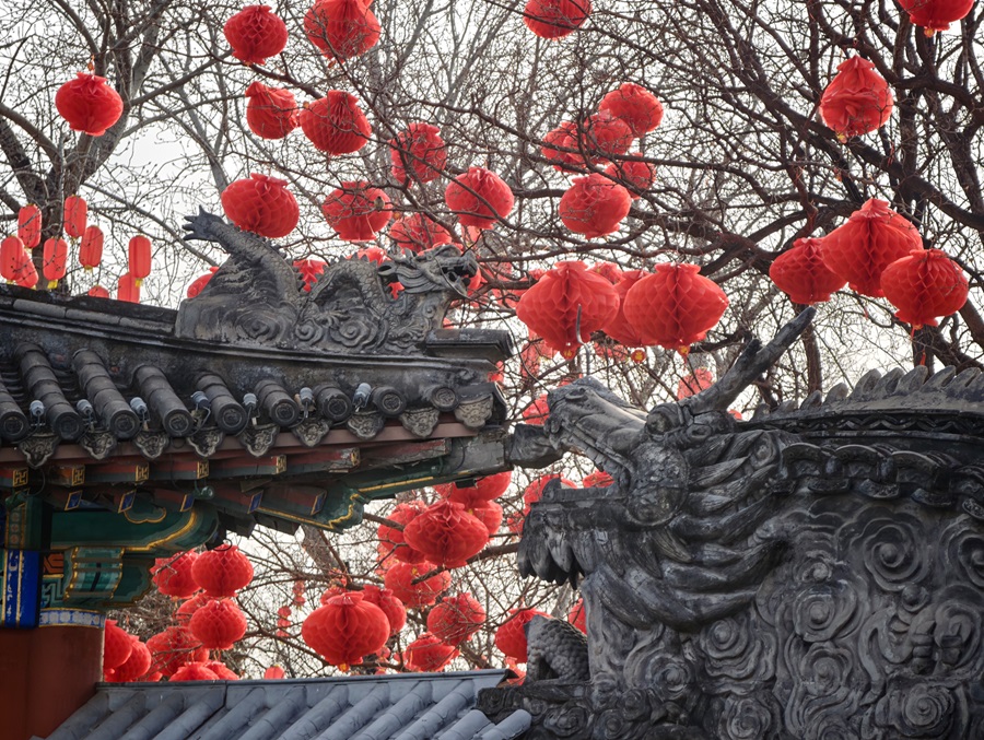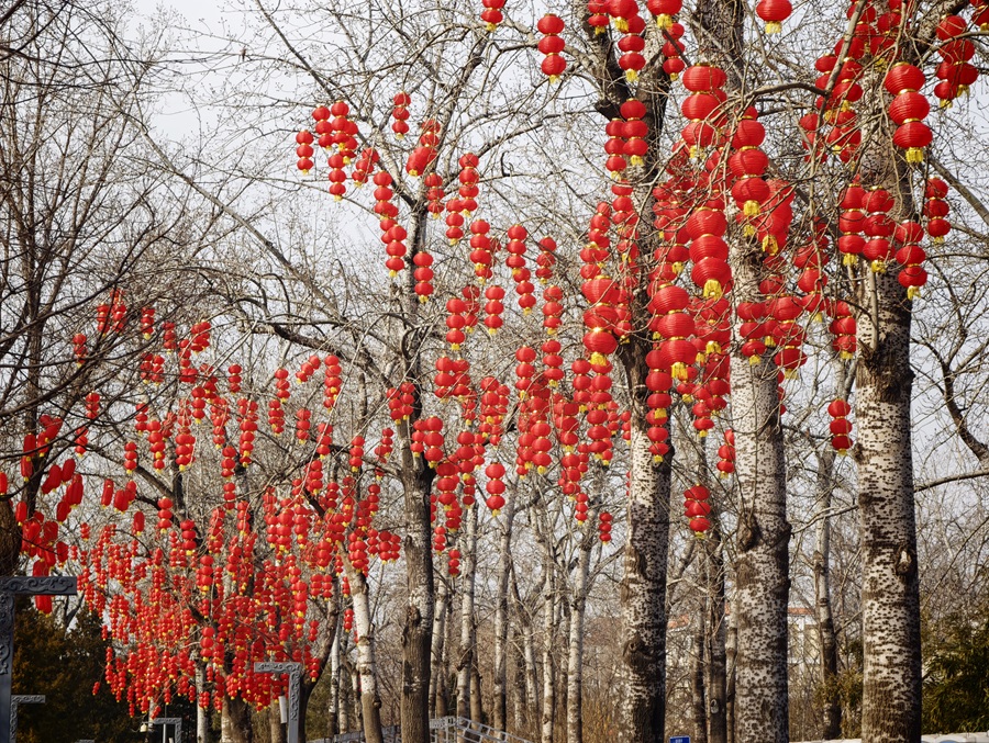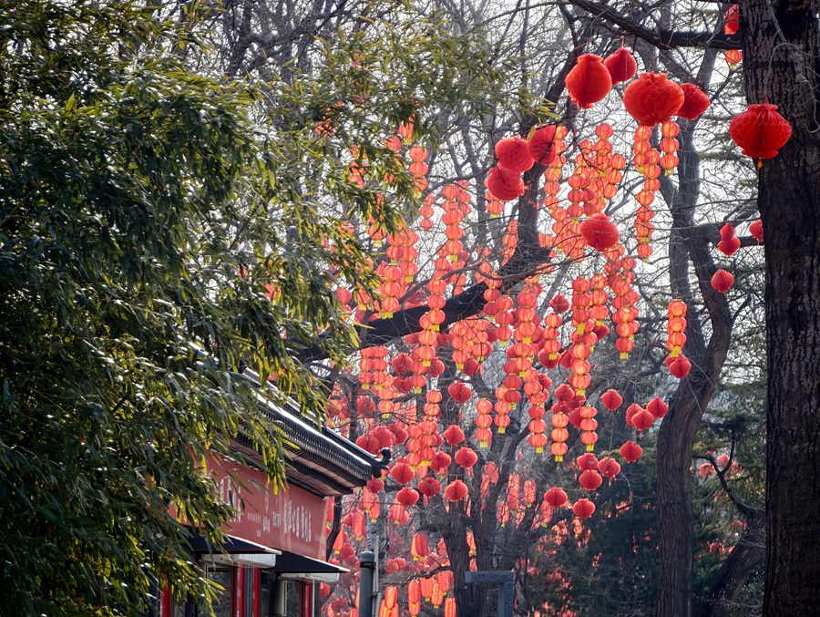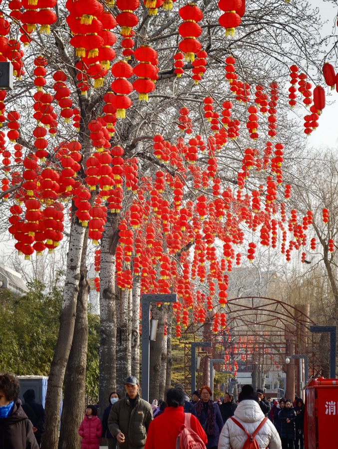 新春将至,龙潭湖公园内张灯结彩,工人们正紧锣密鼓推进第四十届龙潭春节文化庙会布展工作,红灯笼、特色美陈次第亮相,浓浓年味扑面而来。本届庙会以“京韵年·烟火集”为主题,将于2月17日至23日(正月初一至初七)迎客。(摄影:樊荣禄)