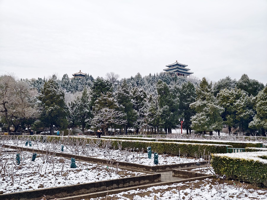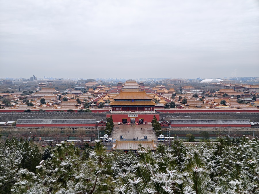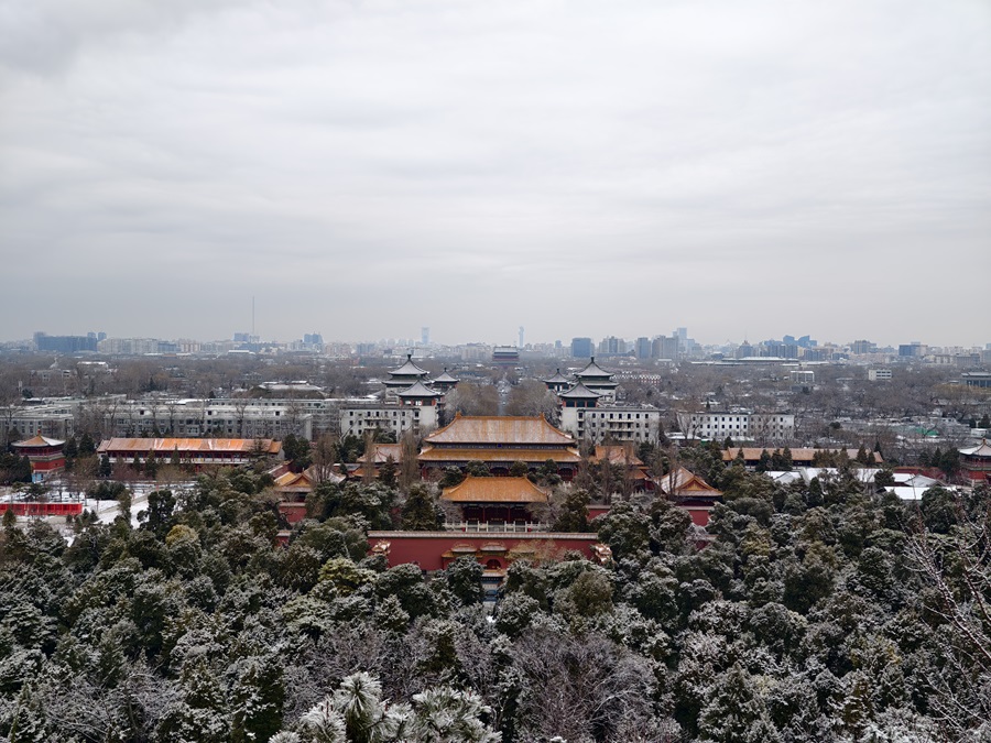 马年的第一场雪悄然而至。银絮纷扬中,景山万春亭化身最佳观景台。南望紫禁城红墙覆雪,东观现代楼宇披上素纱,古今对话于漫天飞雪间悄然展开。