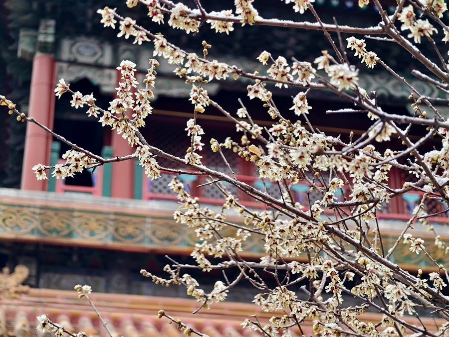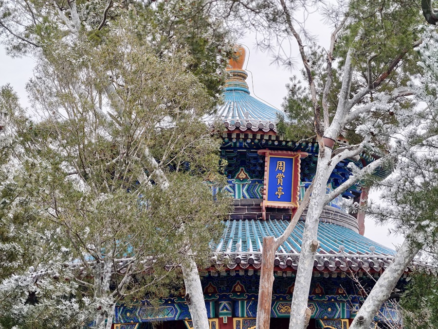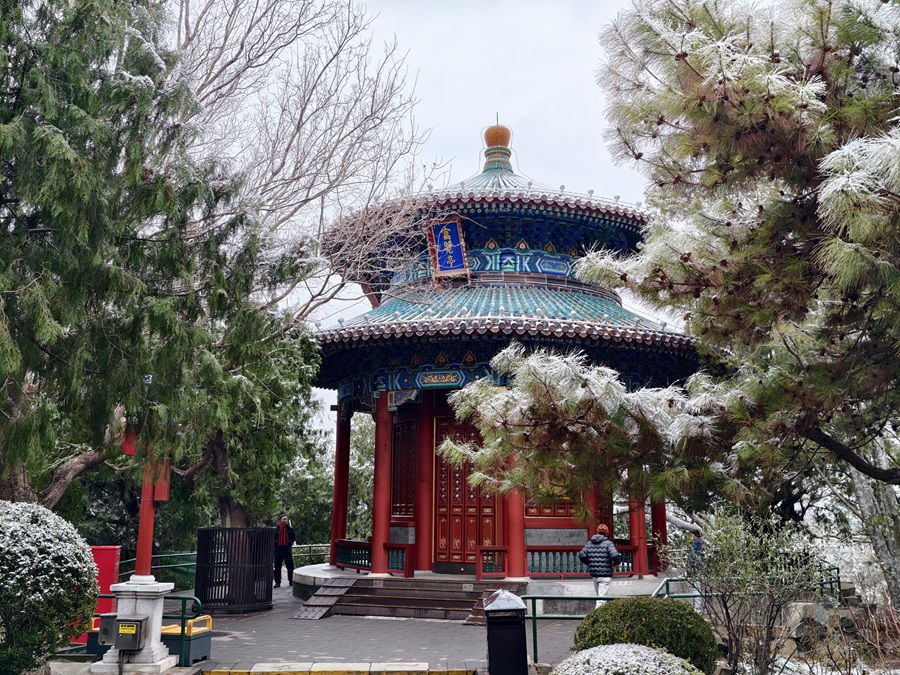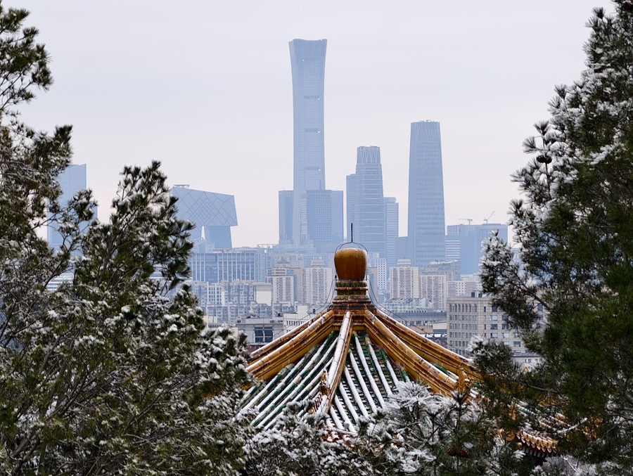 马年的第一场雪悄然而至。银絮纷扬中,景山万春亭化身最佳观景台。南望紫禁城红墙覆雪,东观现代楼宇披上素纱,古今对话于漫天飞雪间悄然展开。(摄影:李梦岚 刘鑫雨)