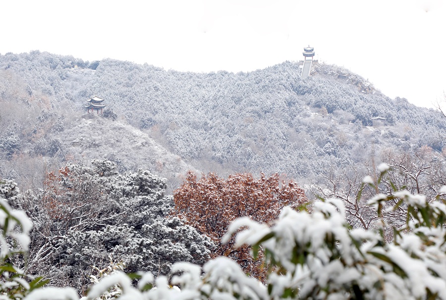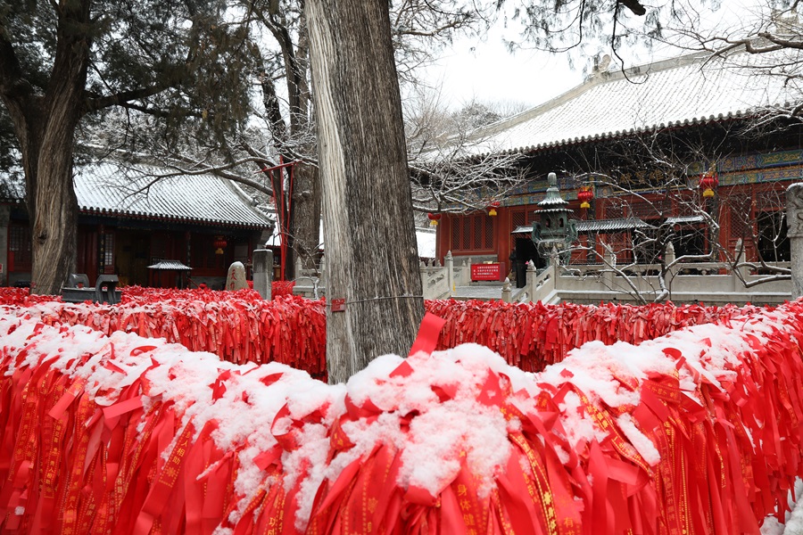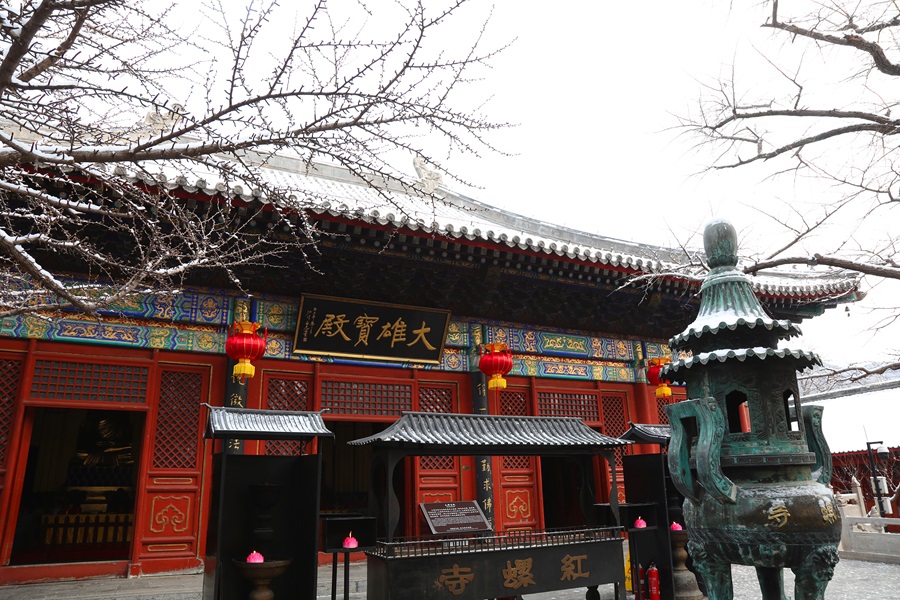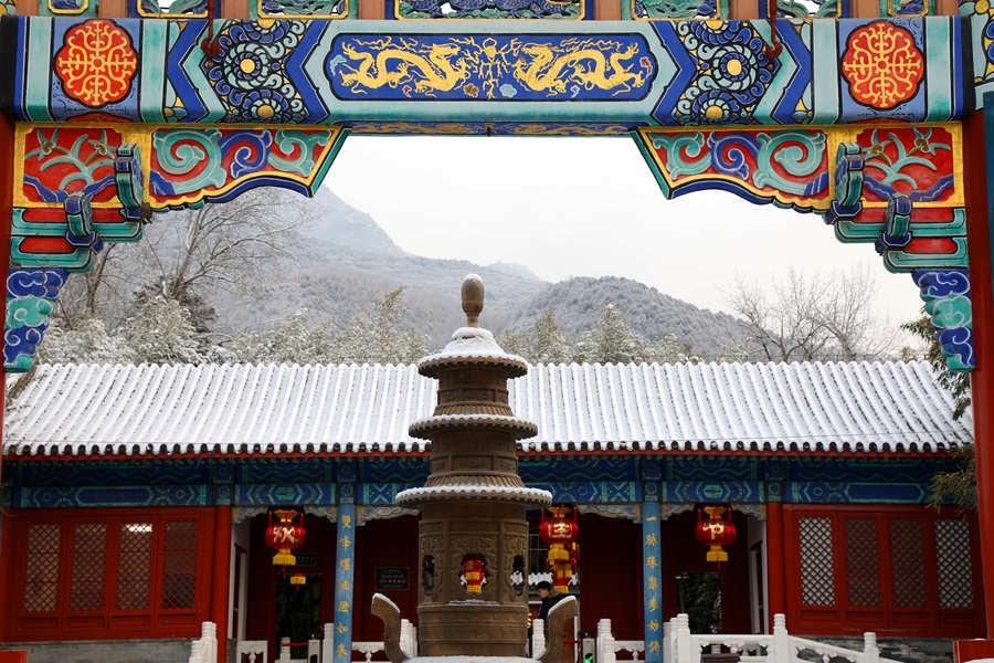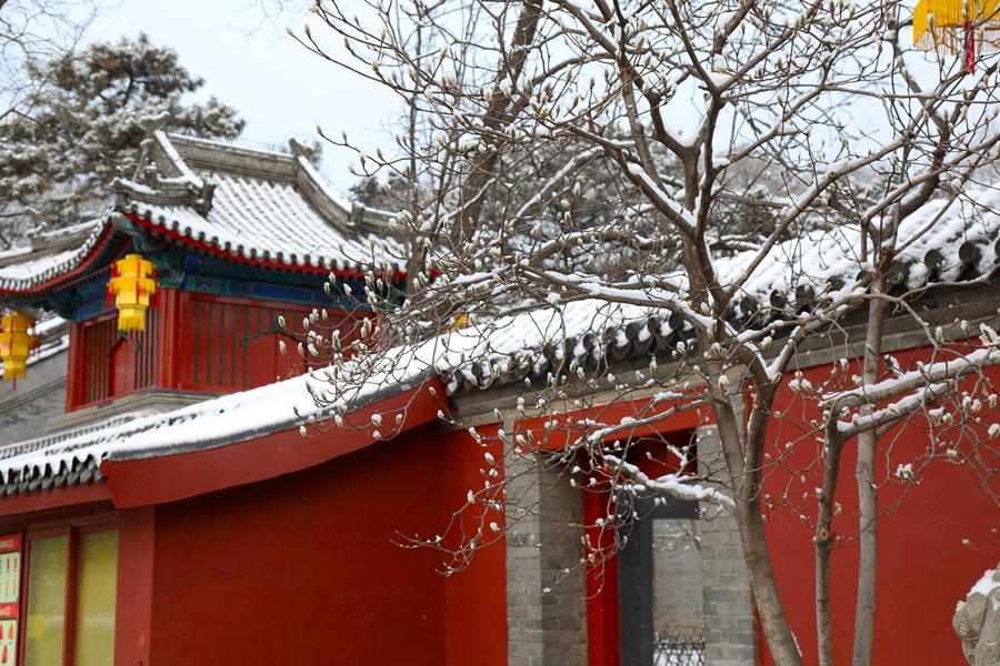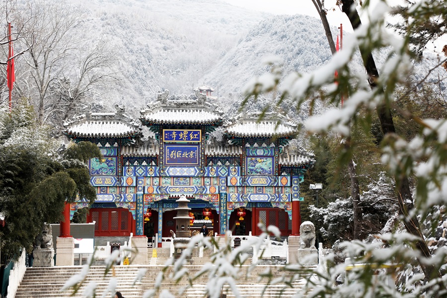 怀柔喜迎马年初雪。千年古刹红螺寺在漫天飞舞的雪花中银装素裹,呈现出“深山藏古寺,白雪映朱红”的绝美画卷。