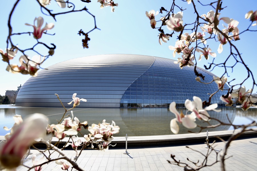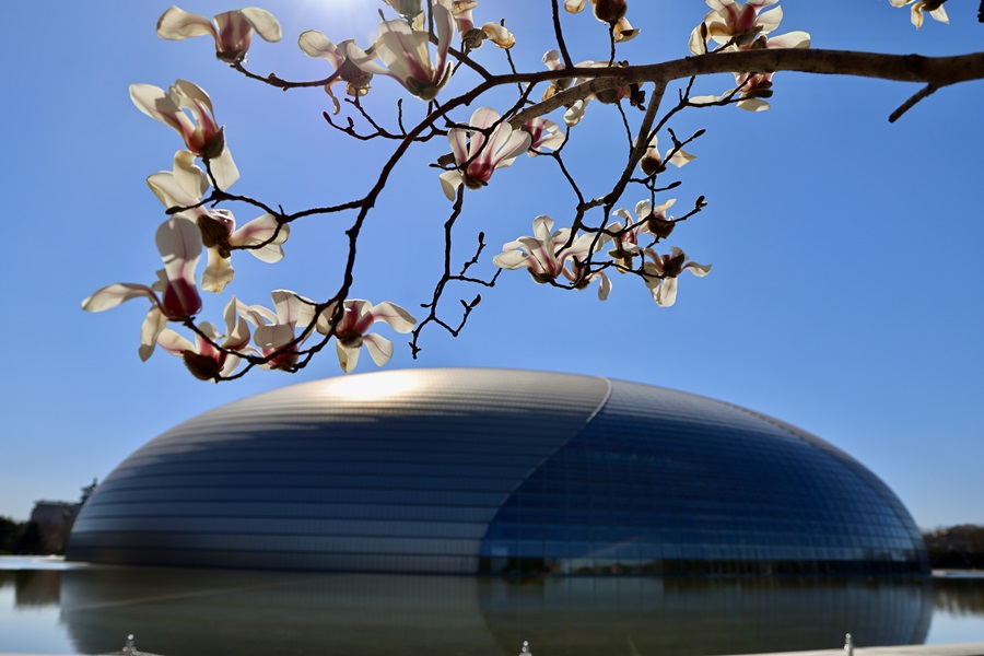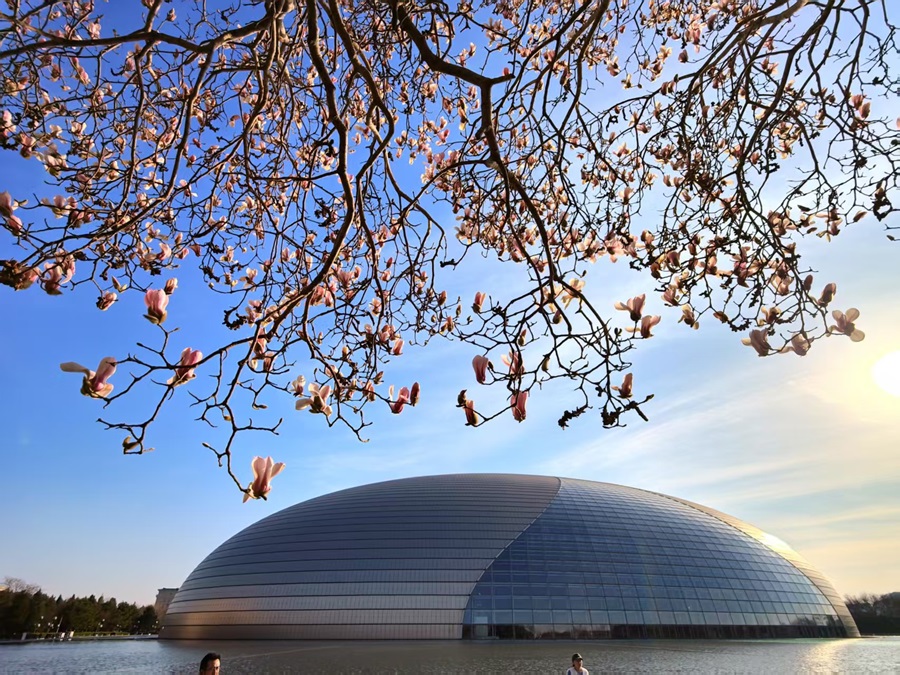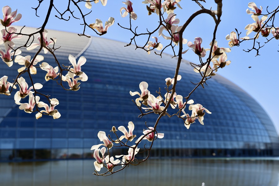 春日最动人的景致莫过于枝头的玉兰。长安街边玉兰与国家大剧院穹顶相映,乐声丝丝入耳,花香缕缕沁脾。光秃枝桠上,硕大的花朵虽无叶片点缀左右,却将“玉洁冰清”的气质演绎得淋漓尽致。(摄影:李磊)